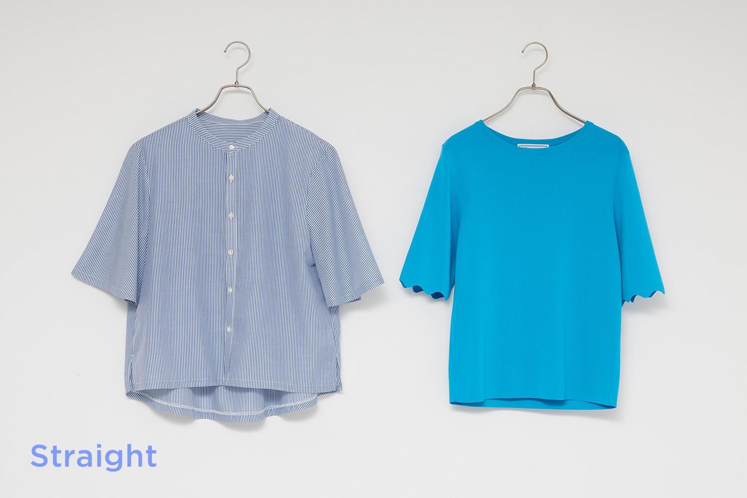 (右)立体感なストレートは、装飾の少ないシンプルなデザインを選ぶと、スタイルのよさが際立ちます。きちんとした印象のジャストサイズ、クルーネックも似合うポイントです。シンプルなアイテムが得意なストレートは、カラーで個性を演出するのがコツ。