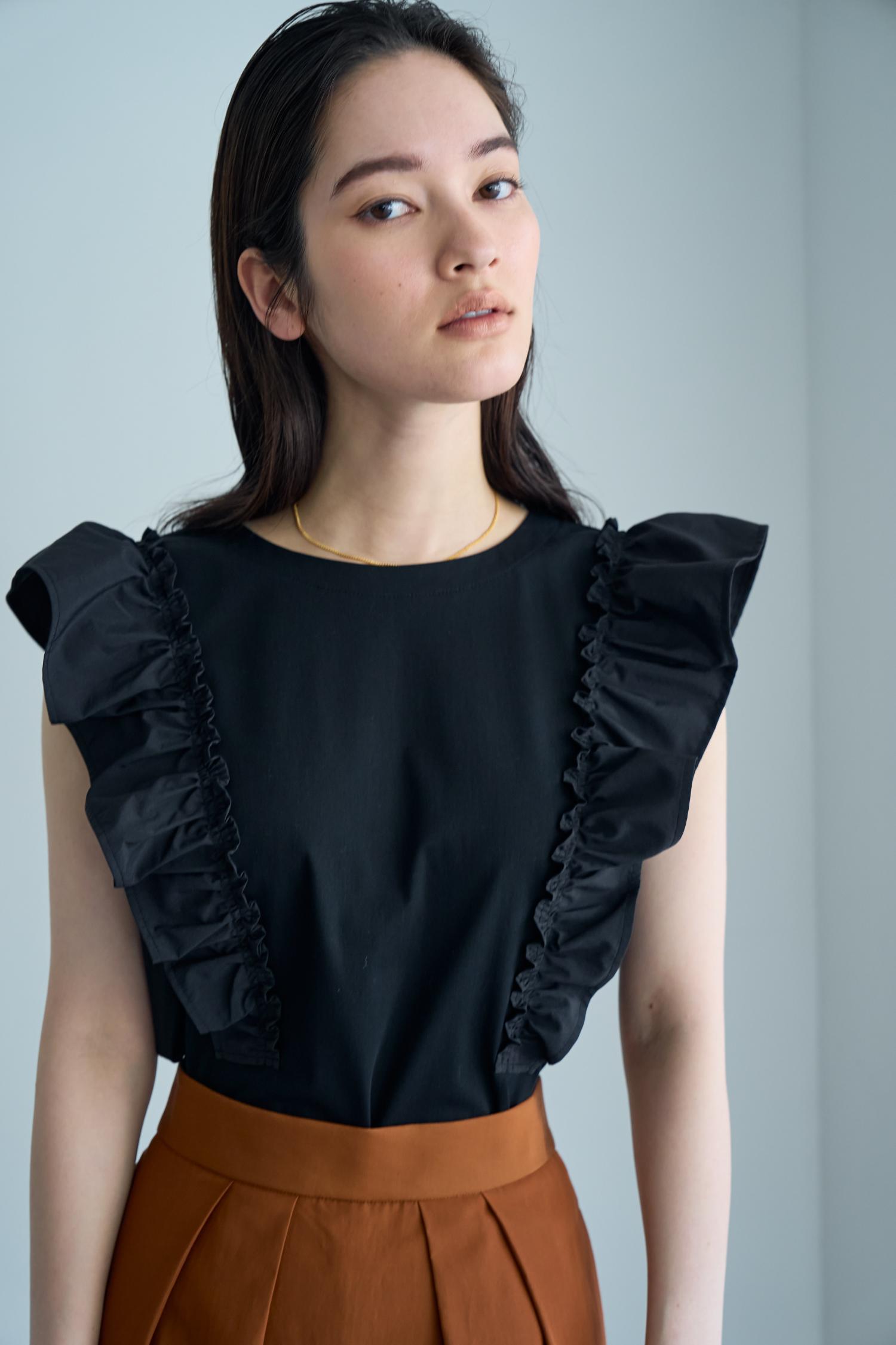 フリル部分はハリのある素材で肩先まで掛かり気になる二の腕をカバーしてくれます。