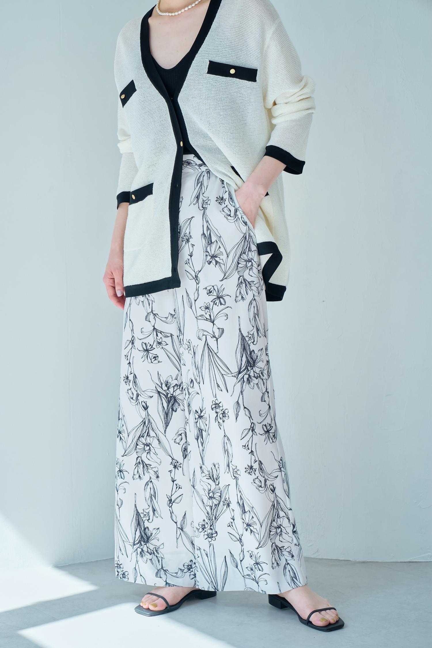 線画タッチのフラワーリーフをモノトーンでモダンなプリントに仕上げました。