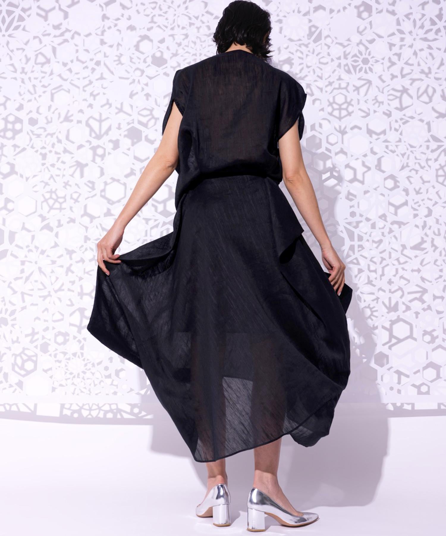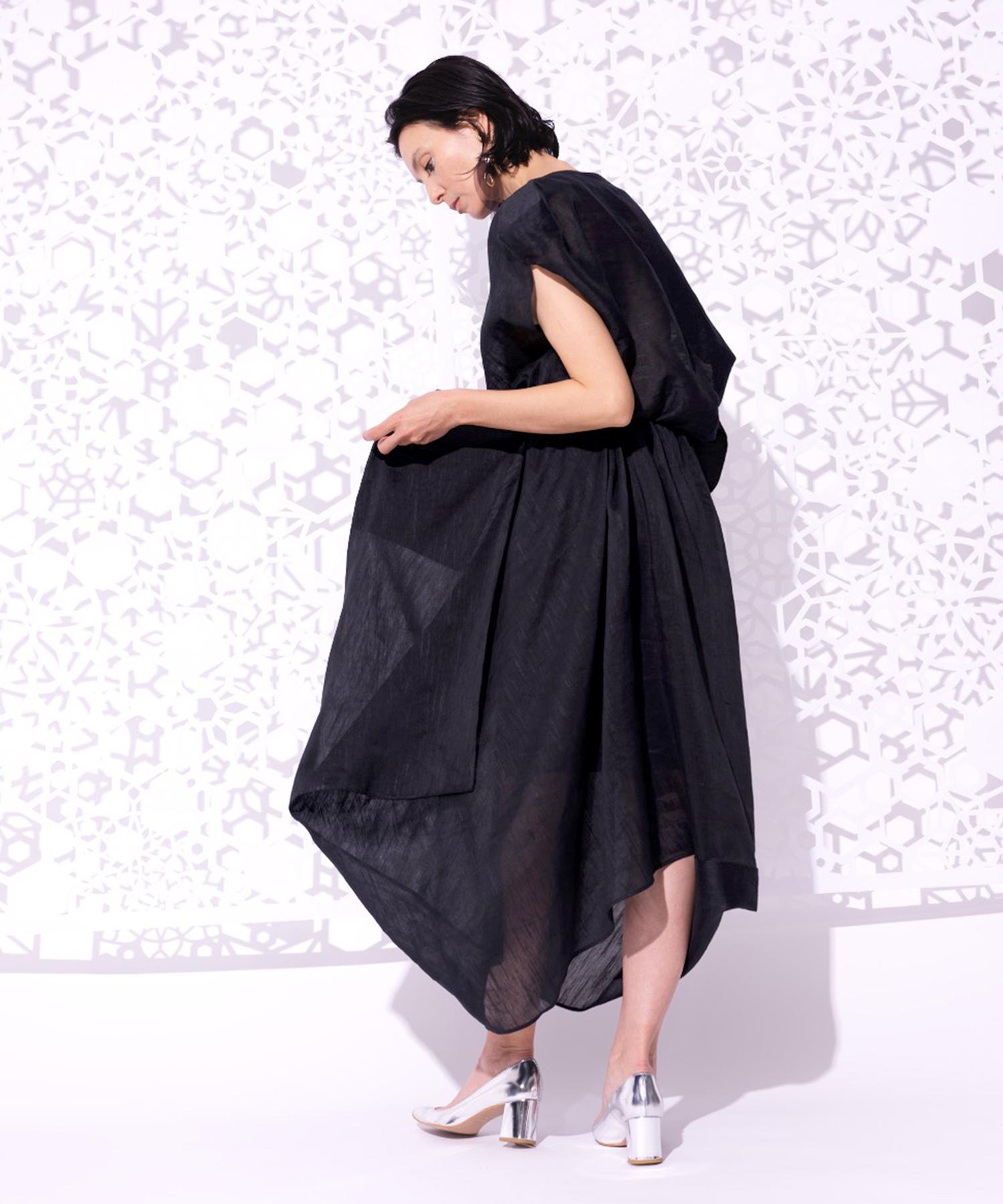 アシンメトリーにところどころに入れたタックの膨らみがデコラティブな表情を作ります。