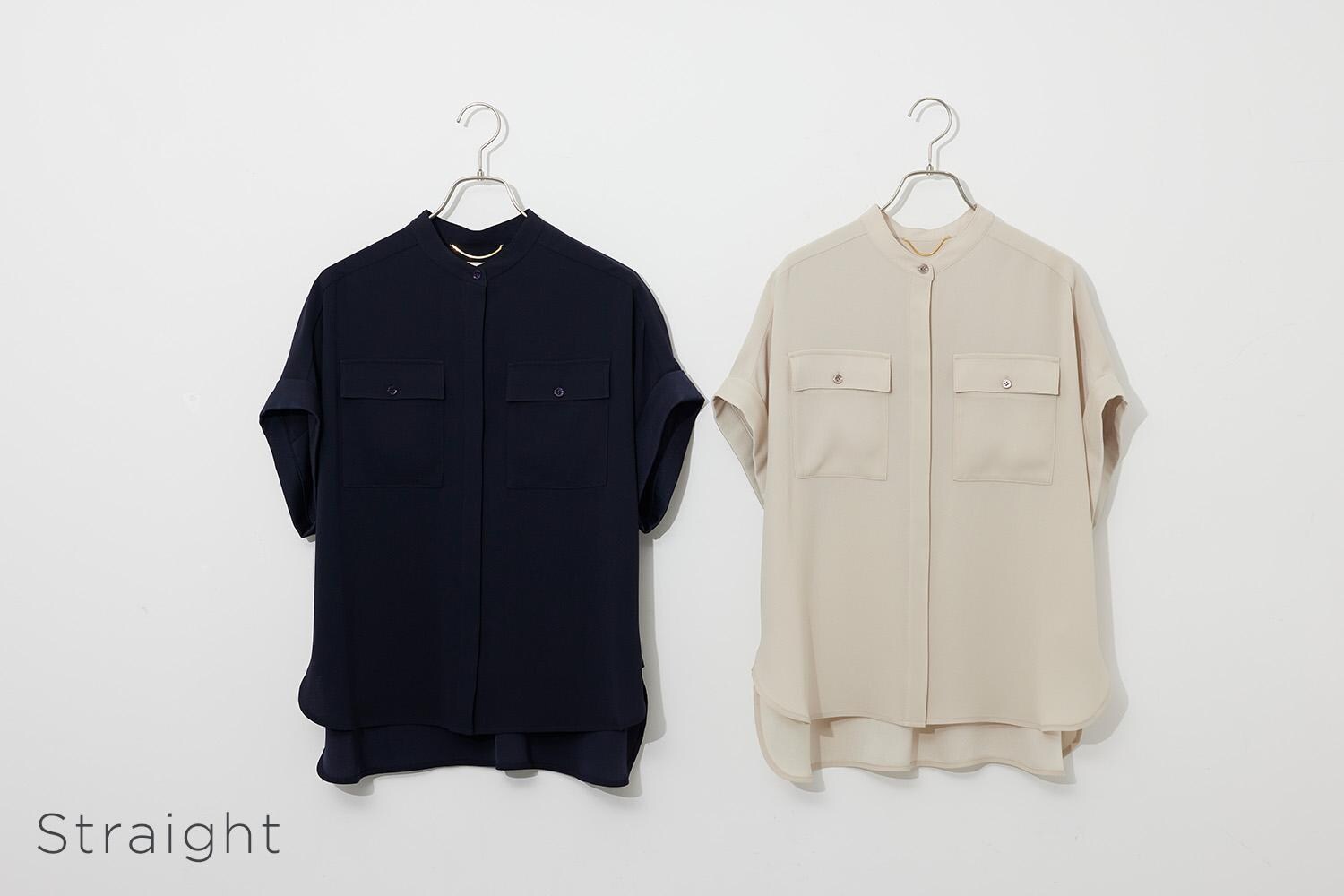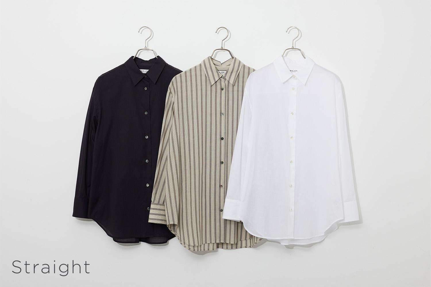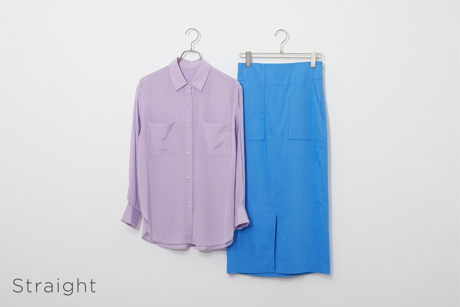 (左)シンプルシャツが似合うストレートは、素材で旬らしさを取り入れるのがコツ。軽やかさがありながら、上品な光沢とハリ感もあるローン素材のシャツはまさに最適です。クラシカルなパールボタンもストレート向きで◎。涼やかなラベンダーカラーもグット。