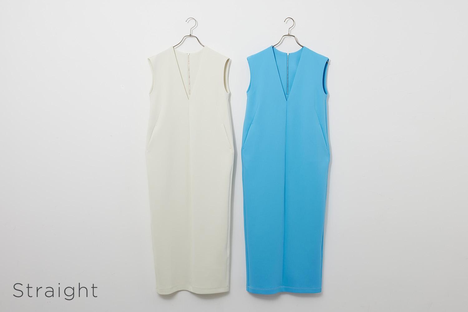 きれいな表面感でストンとしたIラインをつくる、ダンボール素材のワンピース。ほどよく厚みのある素材がグラマラスなボディをカバーし、すっきり見せます。深めのVネックも上半身にボリュームがあるストレートを細見えさせるポイント。バックにスリットが入っているので、カジュアルになりすぎず、品よく着こなせます。