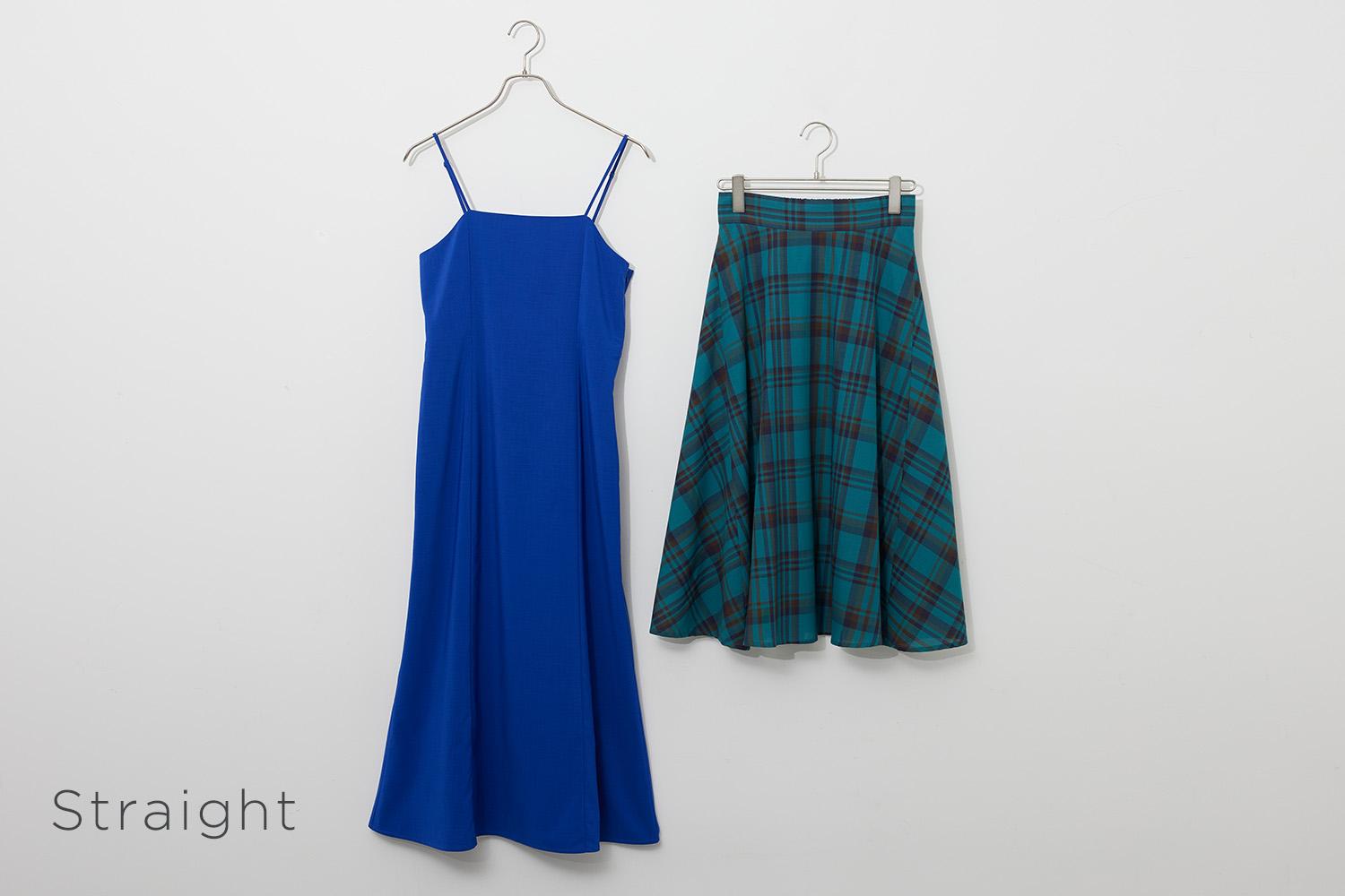 (右)ストレートが似合うフレアスカートは、ウエストからフラットに面で広がっていくデザインのもの。気になる腰まわりをすっきり見せるので、ストレートでもすらりと着こなせます。甘すぎず、カジュアルすぎないエレガントなデザイン、素材を選ぶのもストレートに似合うポイントです。