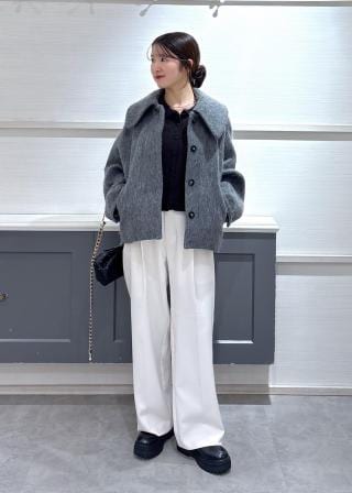 やわらかなオーガンジー素材のブルゾンは、フェミニンが得意なウェーブに、 シャープなニュアンスをプラスしてくれる注目アイテム。コンパクトなサイズ 感とボリューム袖のバランスがウェーブ向きなので、すんなり似合います。袖 をあげて、ボリュームを出すとさらに華やかな印象に。1 枚あるとコーデの幅 が広がることまちがいなし!