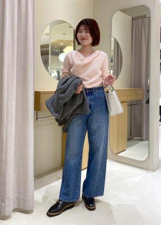 (右)上半身が華奢なウェーブが着映えするリブニット。スカラップネックはデコルテ部分を華やかに演出するので、胸上の足し算が必須なウェーブでもアクセいらずで着こなせます。体に程よくフィットしつつも、さらりとした着心地で肌離れがよいところも◎。