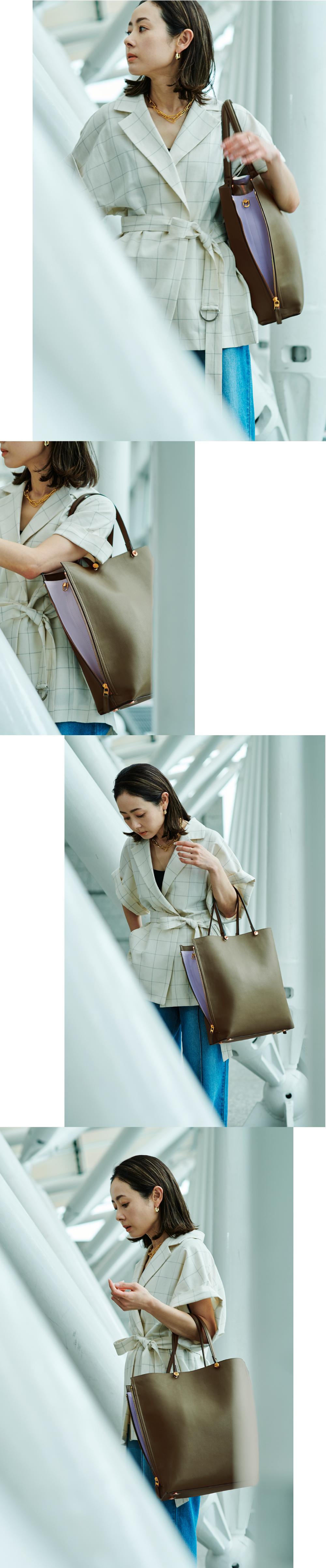 サイドジップを開けると容量が広がり、アクセントになる綺麗なカラーが出現します。丁度いいきちんと感と、遊び心のデザイン。