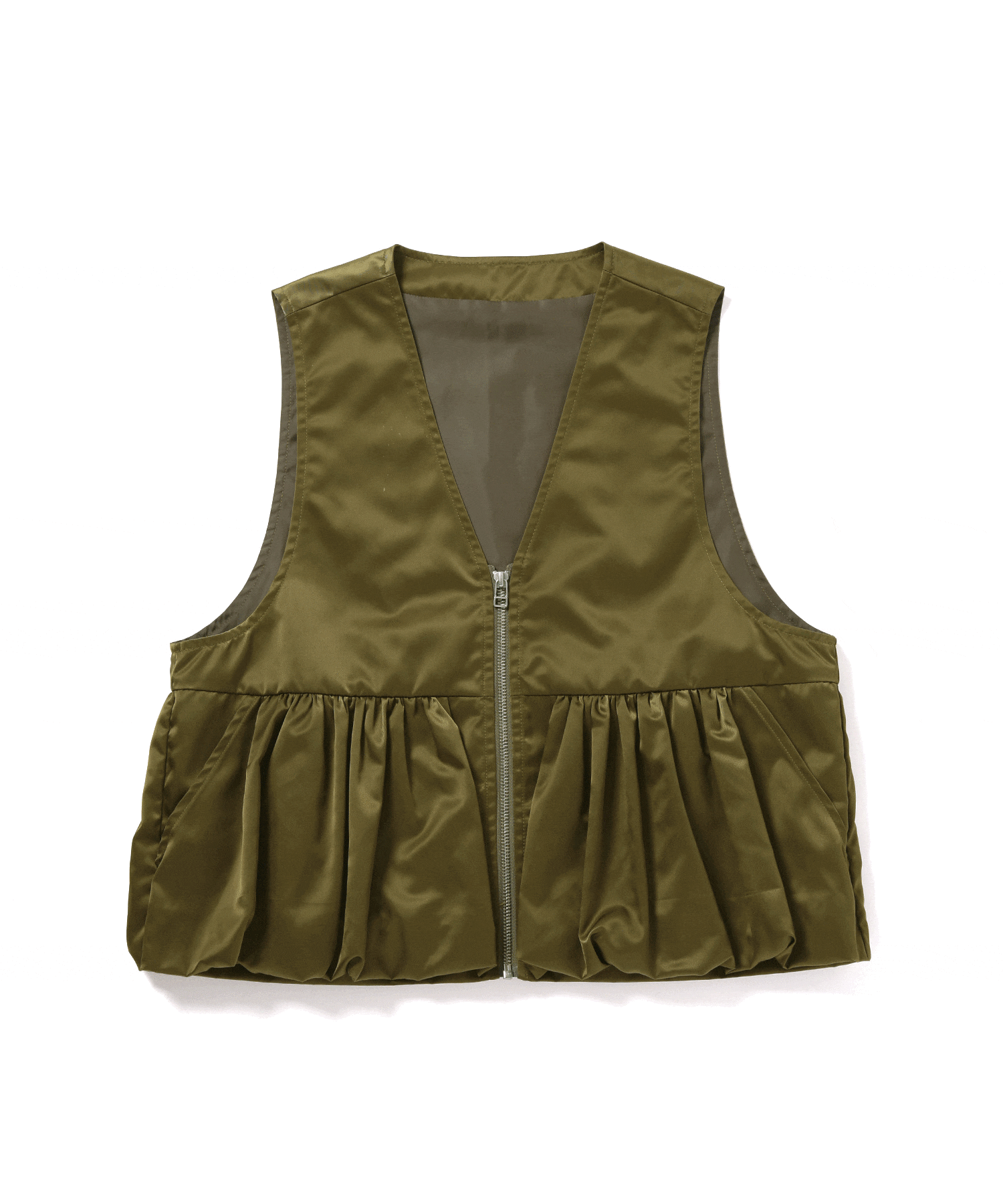 ミリタリーアイテムのようなニュアンスに、バルーン型のペプラムをプラスすることで中性的な印象に仕上げたベスト。