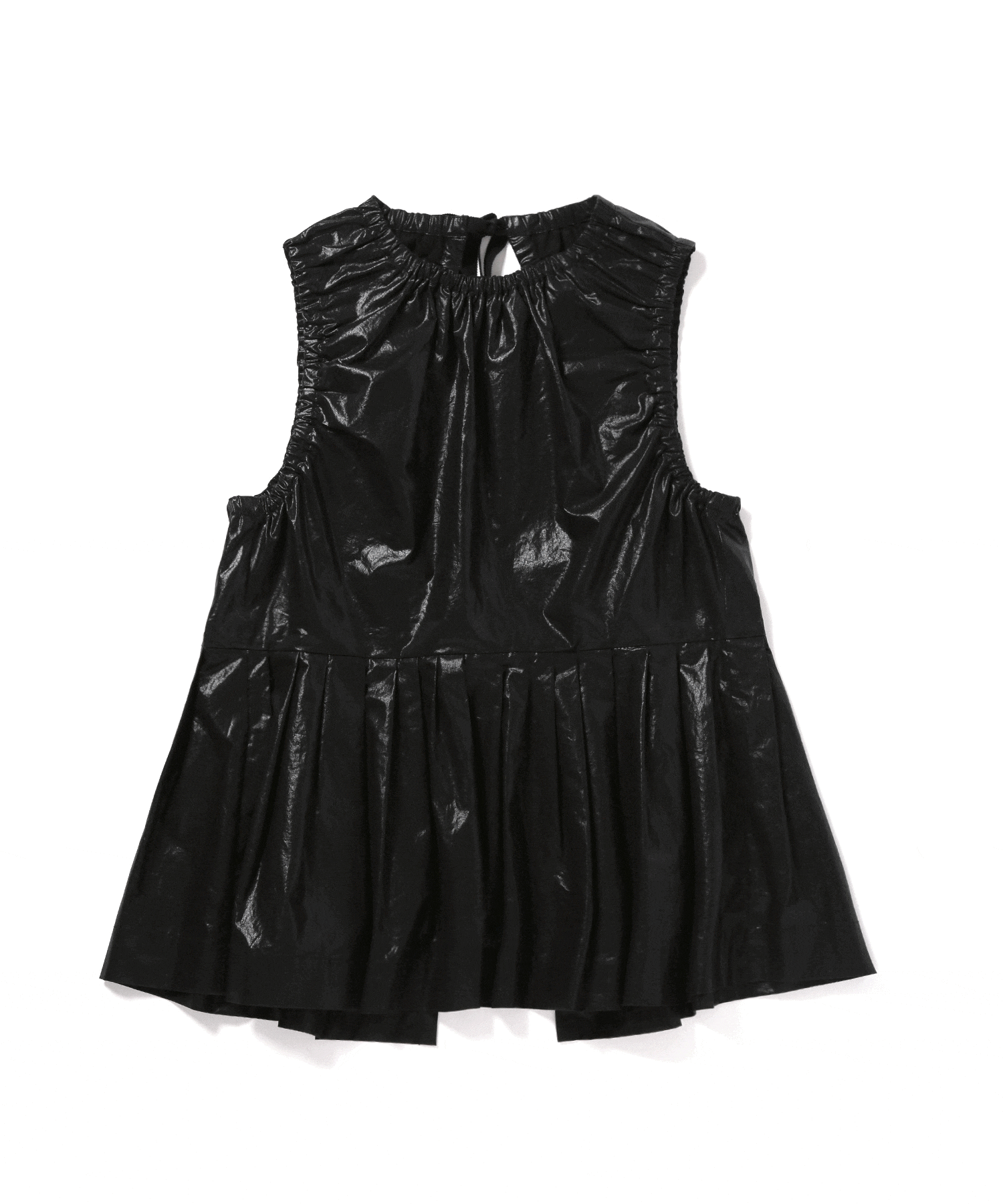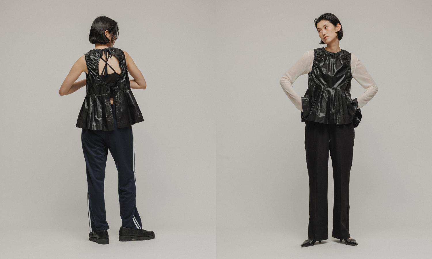 コットンでありながらレザーライクなコーティング加工とクラッシュ感のある生地を使用することで、近未来的でモードな印象に。ランダムプリーツで仕上げたペプラムデザインと、ヘルシーなバックスタイルで甘くなりすぎないところもいい。