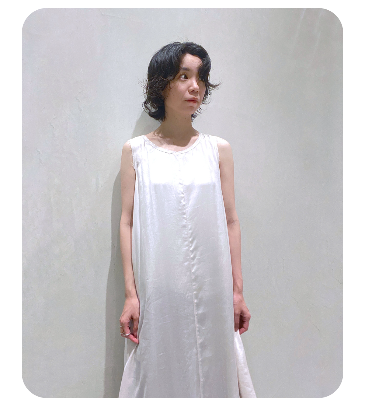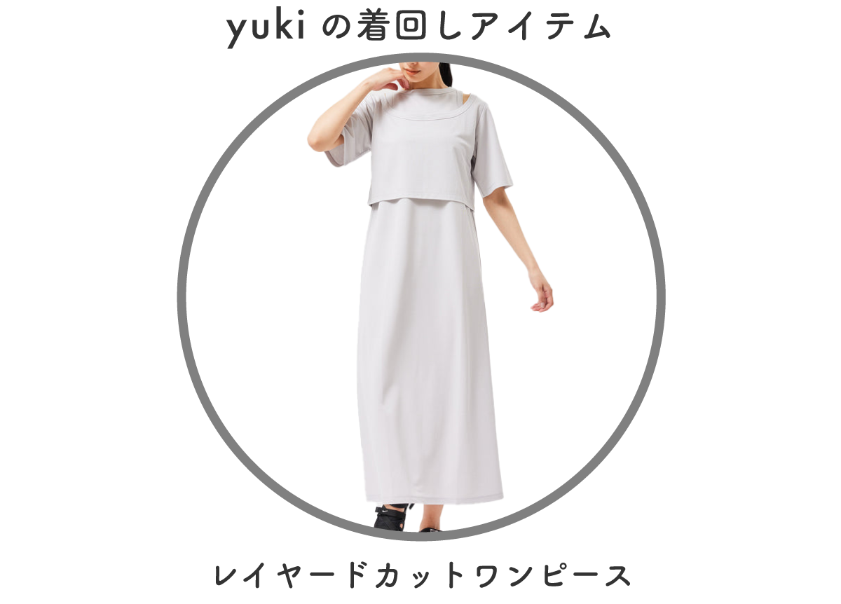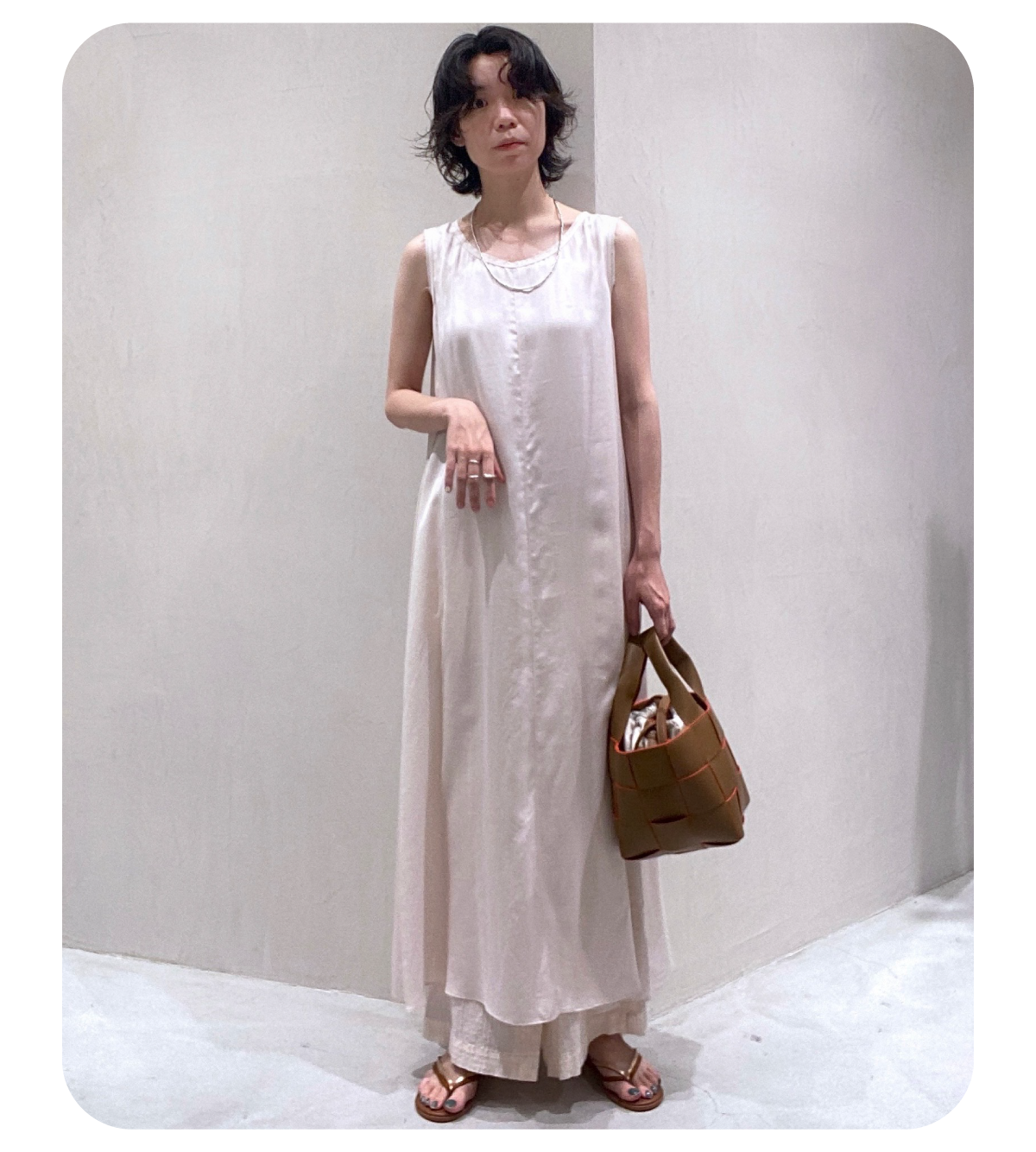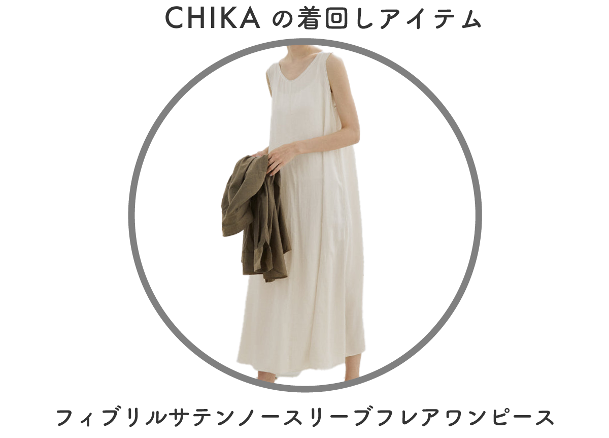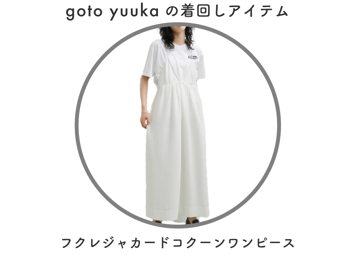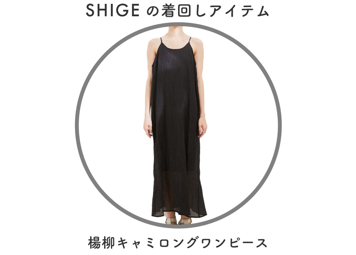 低身長なので着丈が調節可能でジャガード素材が軽い印象のワンピースをメインにスタイリングを組みました。別注のPHEENYノースリーブTを合わせて暑い夏も涼しく、ベージュとホワイトの組み合わせでナチュラルでリラックス感のある雰囲気にしてみました!