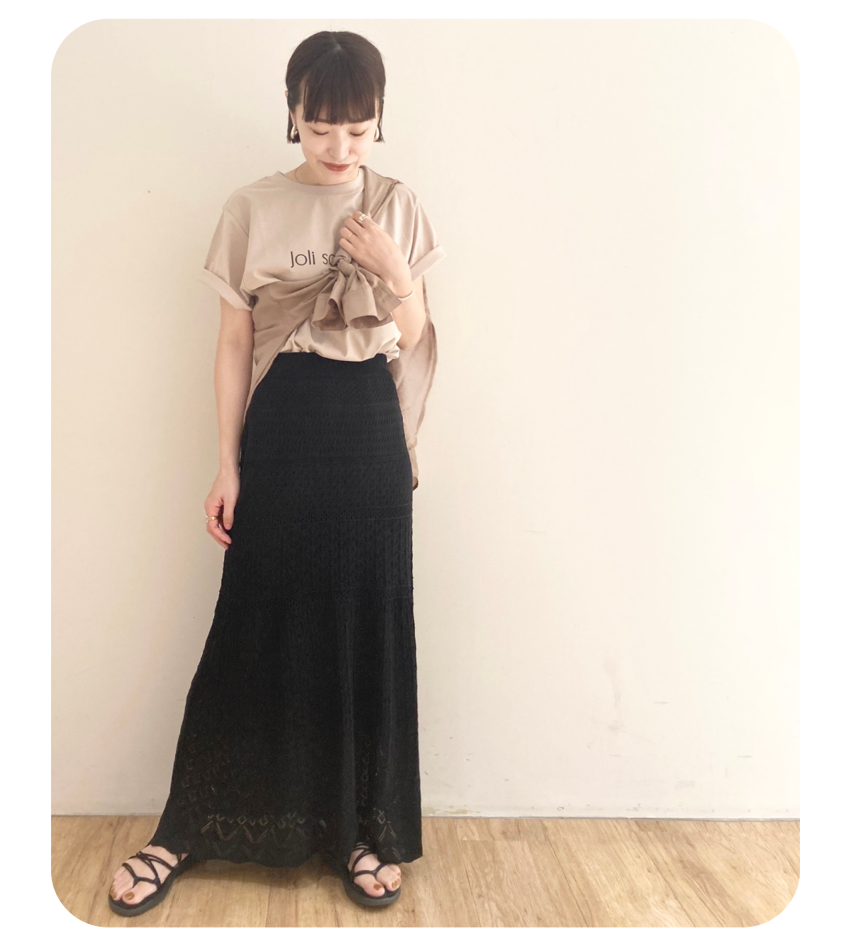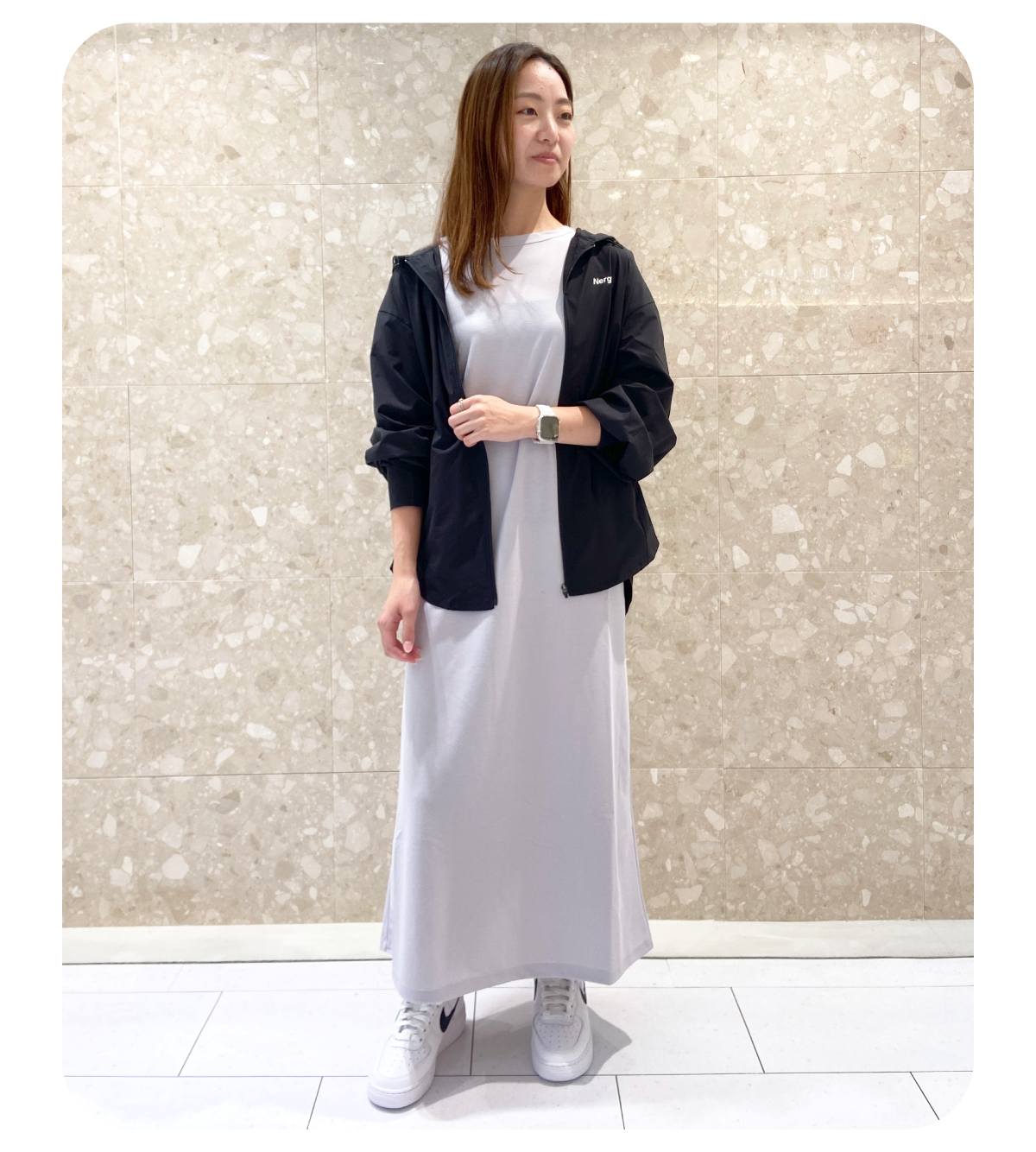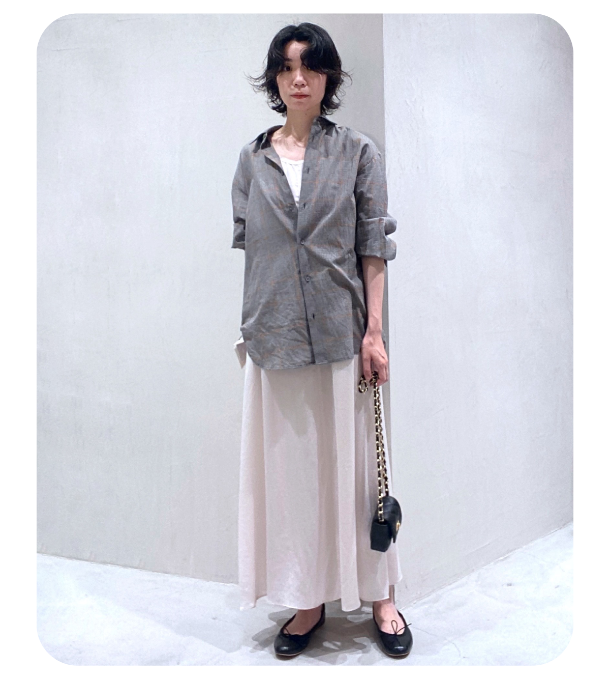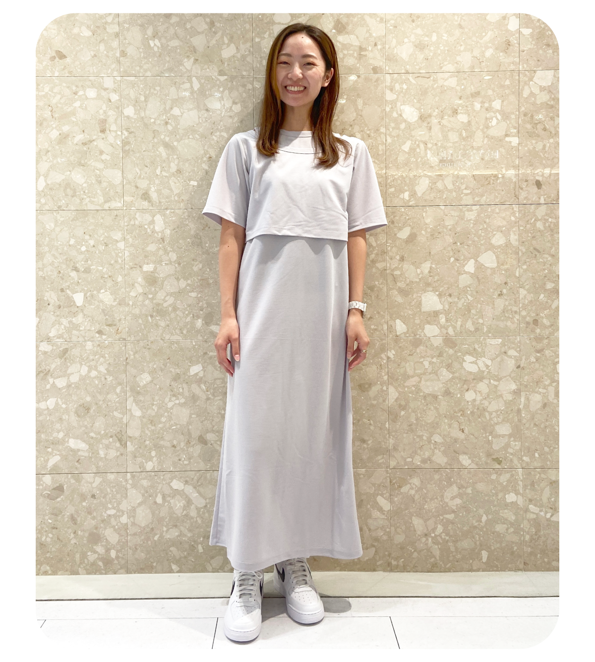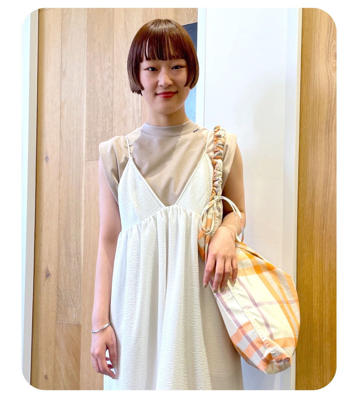 低身長なので着丈が調節可能でジャガード素材が軽い印象のワンピースをメインにスタイリングを組みました。別注のPHEENYノースリーブTを合わせて暑い夏も涼しく、ベージュとホワイトの組み合わせでナチュラルでリラックス感のある雰囲気にしてみました!