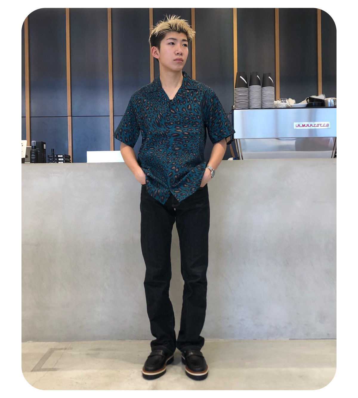 ネイビーのレオパード柄シャツなら、着た瞬間から一気に男らしくなれるアイテム間違いなし!おとなの階段、1段上がっちゃいました!ボトムスは落ち着いた色のデニムで雰囲気が出ます!今回は革靴で合わせましたが、スニーカーでもサンダルでもかっこいいと思います!