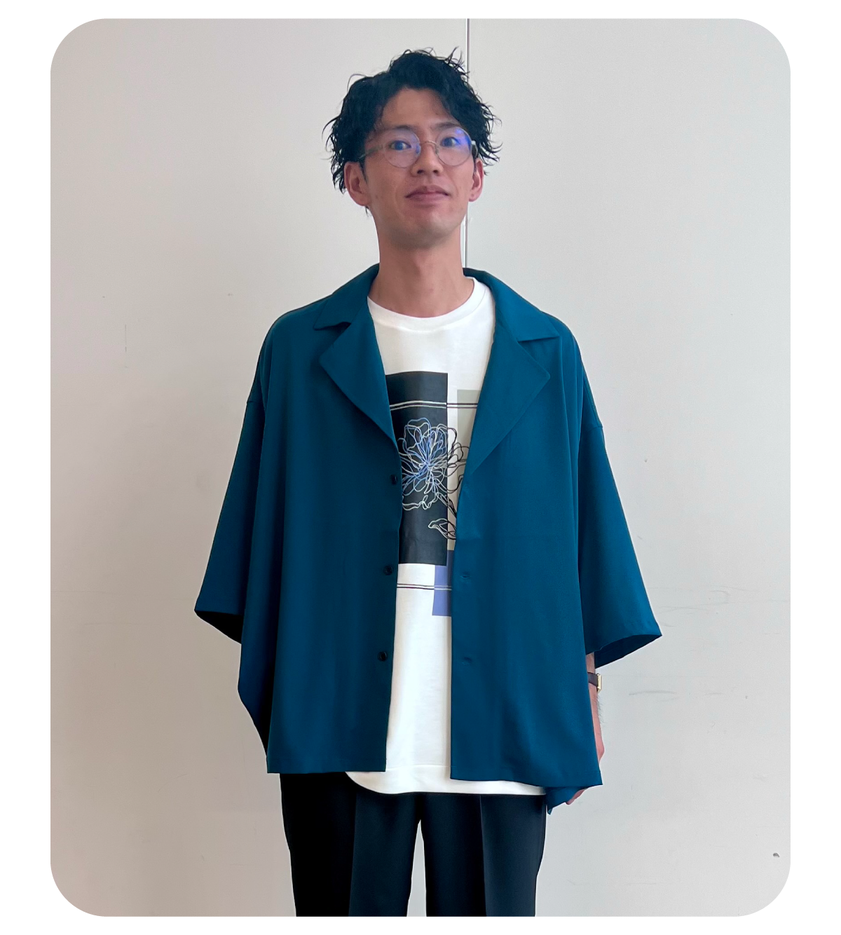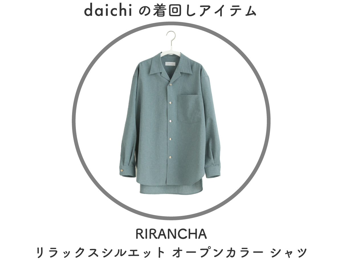 Tシャツ一枚着が多い沖縄県民ですがシャツを羽織って差別化を図ったスタイルです。重ね着しているので暑苦しく見えないよう、明るいブルー寄りのグリーンを選んでコーディネートしました。シャツとパンツのツヤ感が高級感を演出しています。
