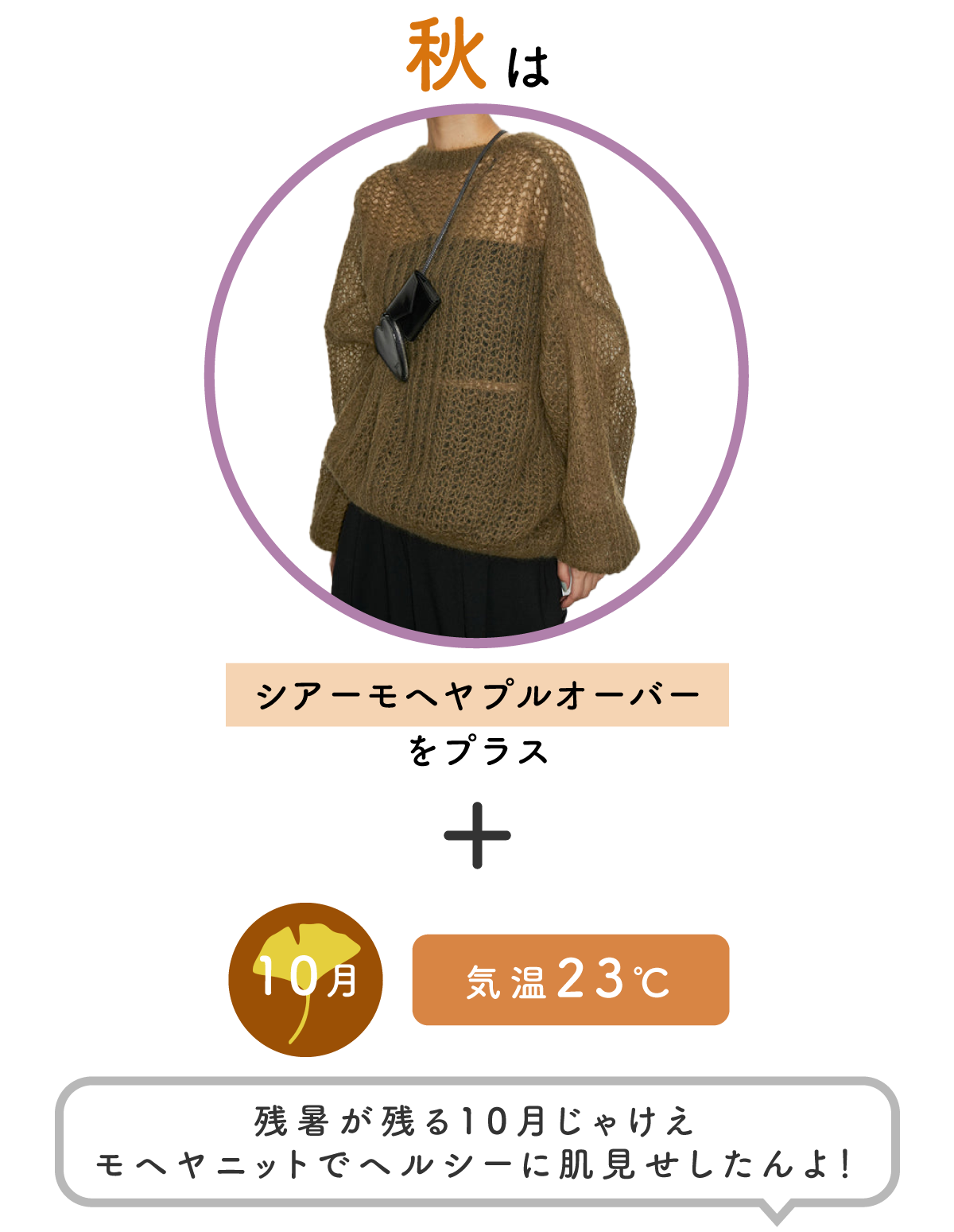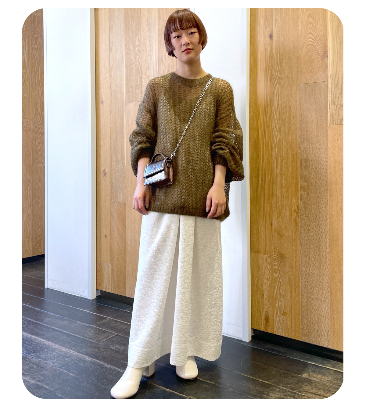 シアーのモヘヤニットで秋しかできないヘルシーな肌見せスタイリングにしました。チェーンミニバッグで華やかさをプラスし、足元もホワイトで軽やかに。秋のお出かけをイメージしました!