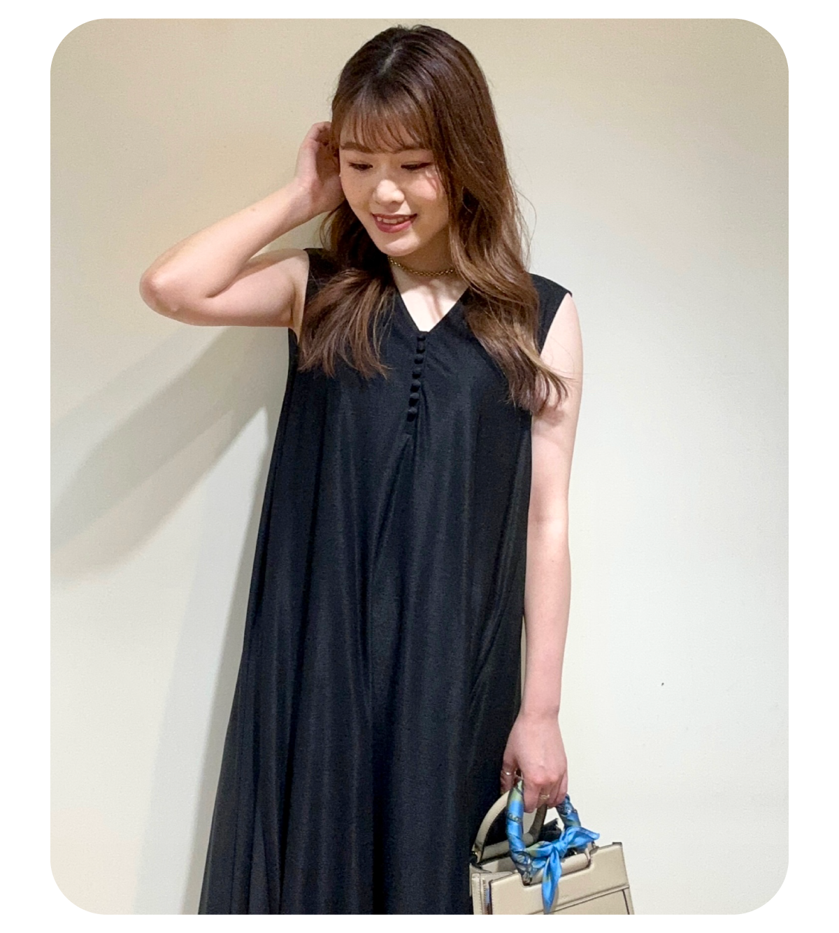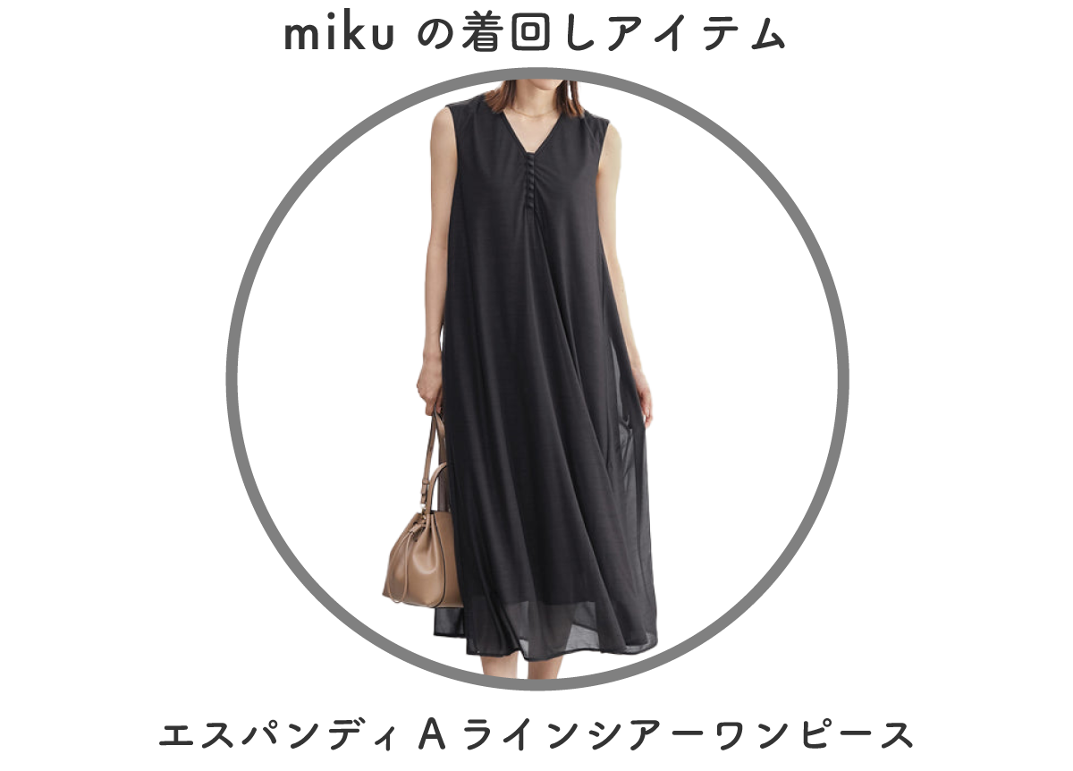 とにかく8月は暑いのでさらっと1枚着できるワンピーススタイリングがおすすめです!軽い素材感で夏場も涼しくお召し頂けますよ。黒のワンピースは重く見えがちなので小物は明るいベージュで軽さを、バッグにはブルーのスカーフで刺し色をプラスし、抜け感を演出しました!