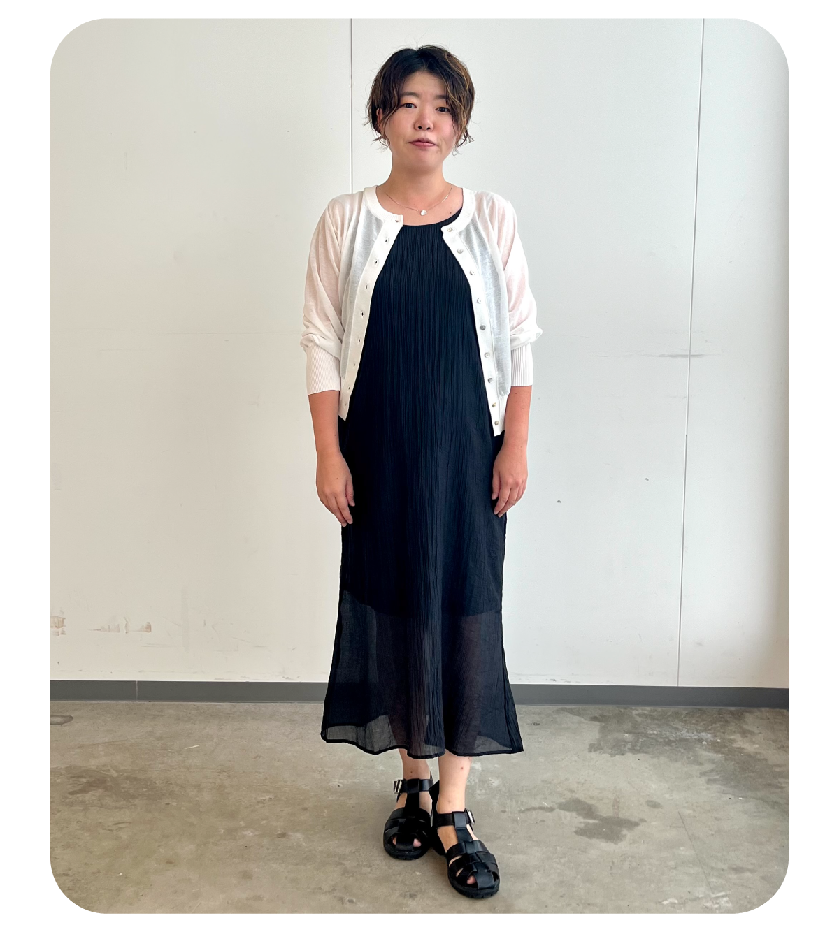沖縄の夏はとにかく紫外線が強いのでキャミワンピースにシアーカーディガンを合わせ、ショートカットヘアのスタイルにも合わせやすいモノトーンでコーディネートにしました。