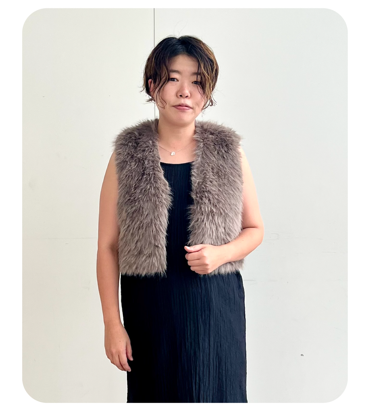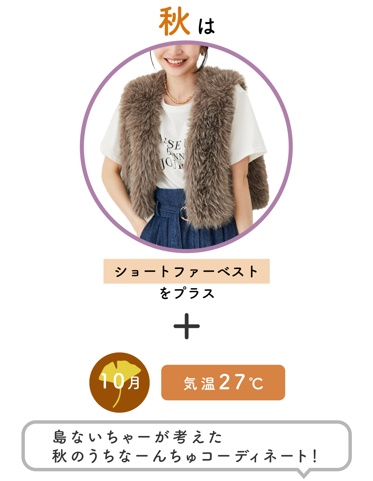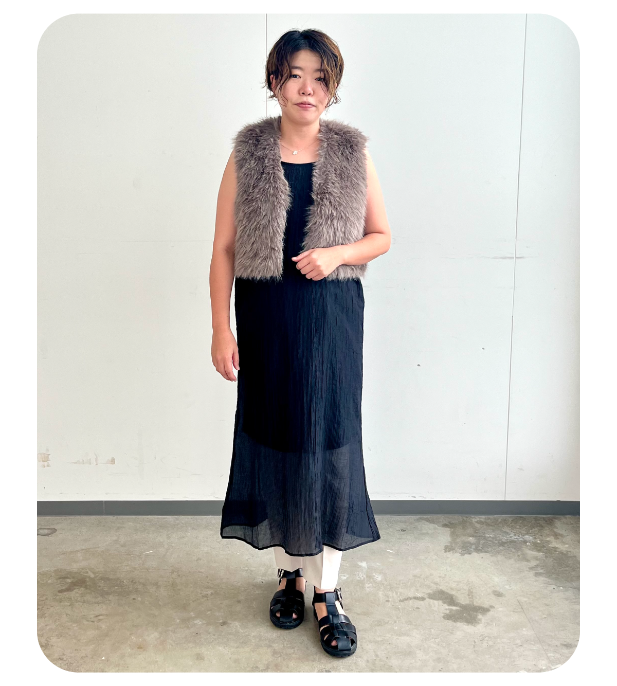 沖縄の10月は日差しは落ち着きますが気温はまだまだ真夏並みなので、キャミワンピースにファーベストで秋らしさを感じるコーディネートにしました!