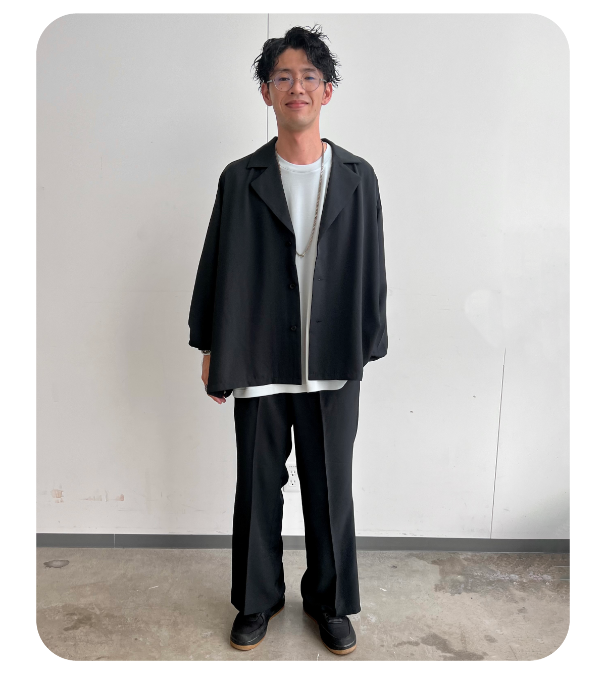 夏はシンプルな服装にどうしてもなりがちですが、素材を変えるだけで雰囲気が変わります!メインはパイル生地のTシャツで、ゆったりとしたワイドなシルエットなのでリラックスしたコーディネートに仕上がります!ボトムスはゴルフラインのワイドシルエットのツータックパンツです!ナイロンパンツなので楽に履けます!スニーカーだと少しルーズに見えるので、革靴でゆったりとしたコーデを締めました!