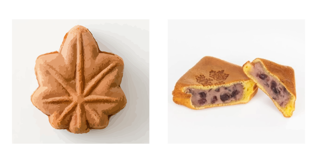 もみじ饅頭は餡子をふっくら焼き上げたカステラ生地で包みふわっと、桐葉菓はもち粉の生地で包み込んでもちっとした食感が魅力です!