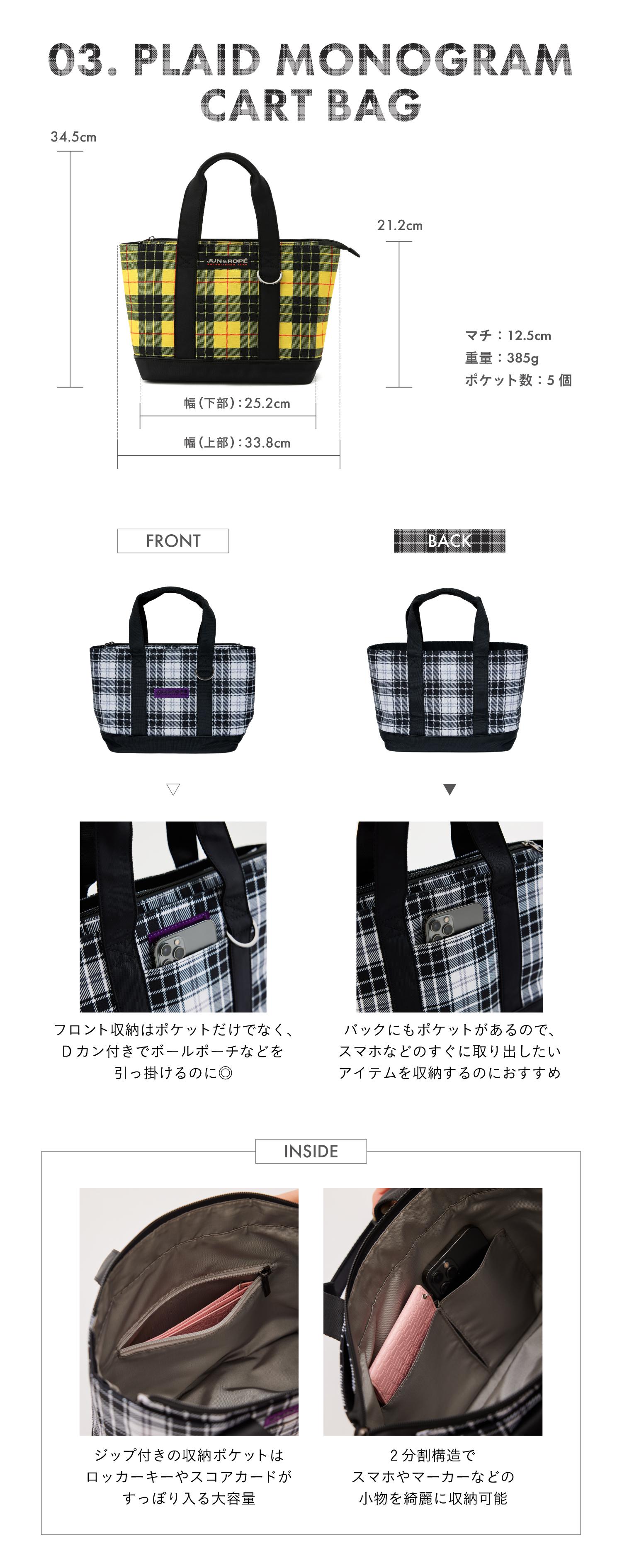 荷物の多いゴルファーに嬉しい大容量カートバッグが登場!シンプルデザインで男女共にご使用いただけるアイテムや、コーディネートのポイントになる柄物アイテムなどを豊富なラインナップで取り揃えております。是非ご覧くださいませ。
