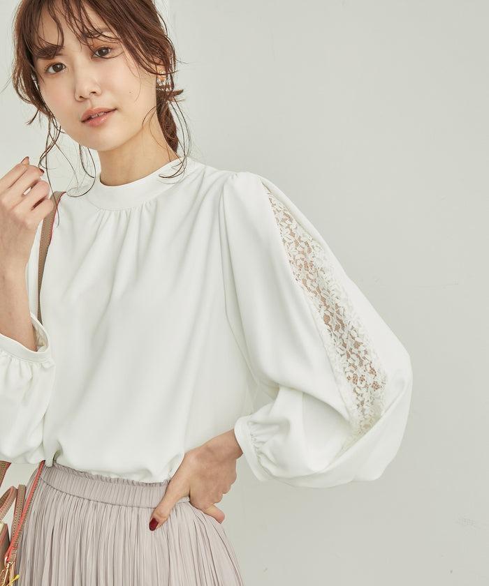 袖の一部をレースで切り替えた、7分袖のプルオーバーブラウス。ニュアンストーンを揃えた、豊富な全5色展開。フレアパンツやワイドパンツ、プリントスカートとも好相性。