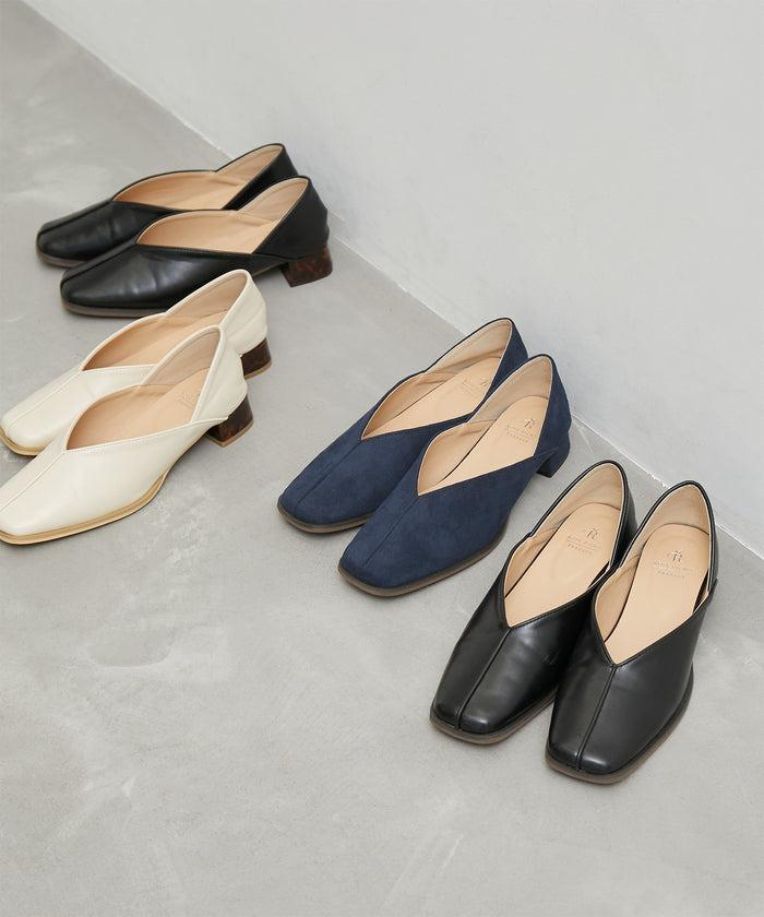 甲をしっかりと覆う、スクエアトゥのヒール付きバブーシュ。かかと部分を踏んで履いても◎ パンツ・スカート問わず、クールなスタイリングに合わせるのがおすすめ。