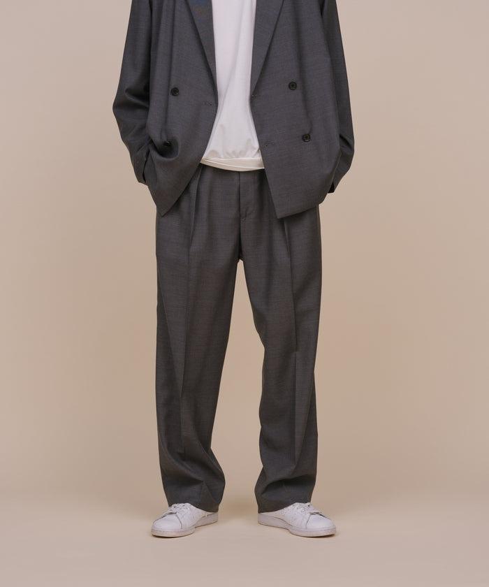 サイドベルトにバックルを施した、アジャスト機能付きのスラックスパンツ。フロントタックの入った、筒も太めのたっぷりとした存在感あるシルエットが魅力。ハイゲージニットをインしたり、ショート丈トップスを合わせた脚長効果のあるバランスでの着用もぜひ。