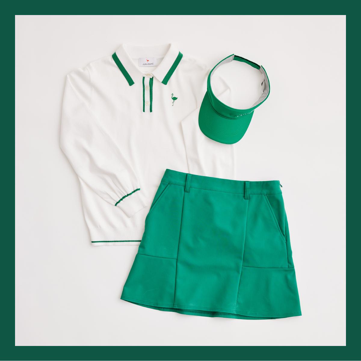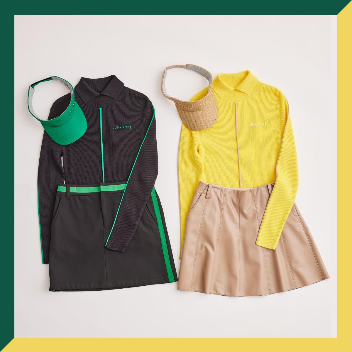 トレンドのグリーンとイエローを差し色に使用したコーデは、華やかなカラーリングでゴルフ場は勿論、SNSでも映えること間違いなし!リブトップスは伸縮性も抜群で動きやすく、冬にはインナーとしても大活躍する主役級アイテムです。