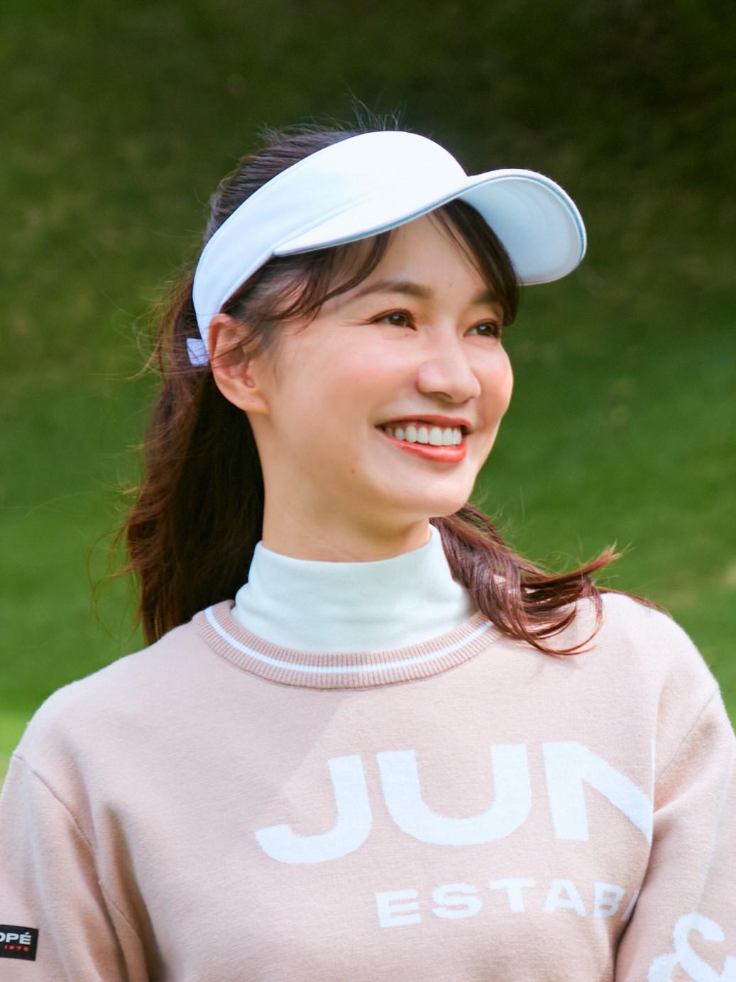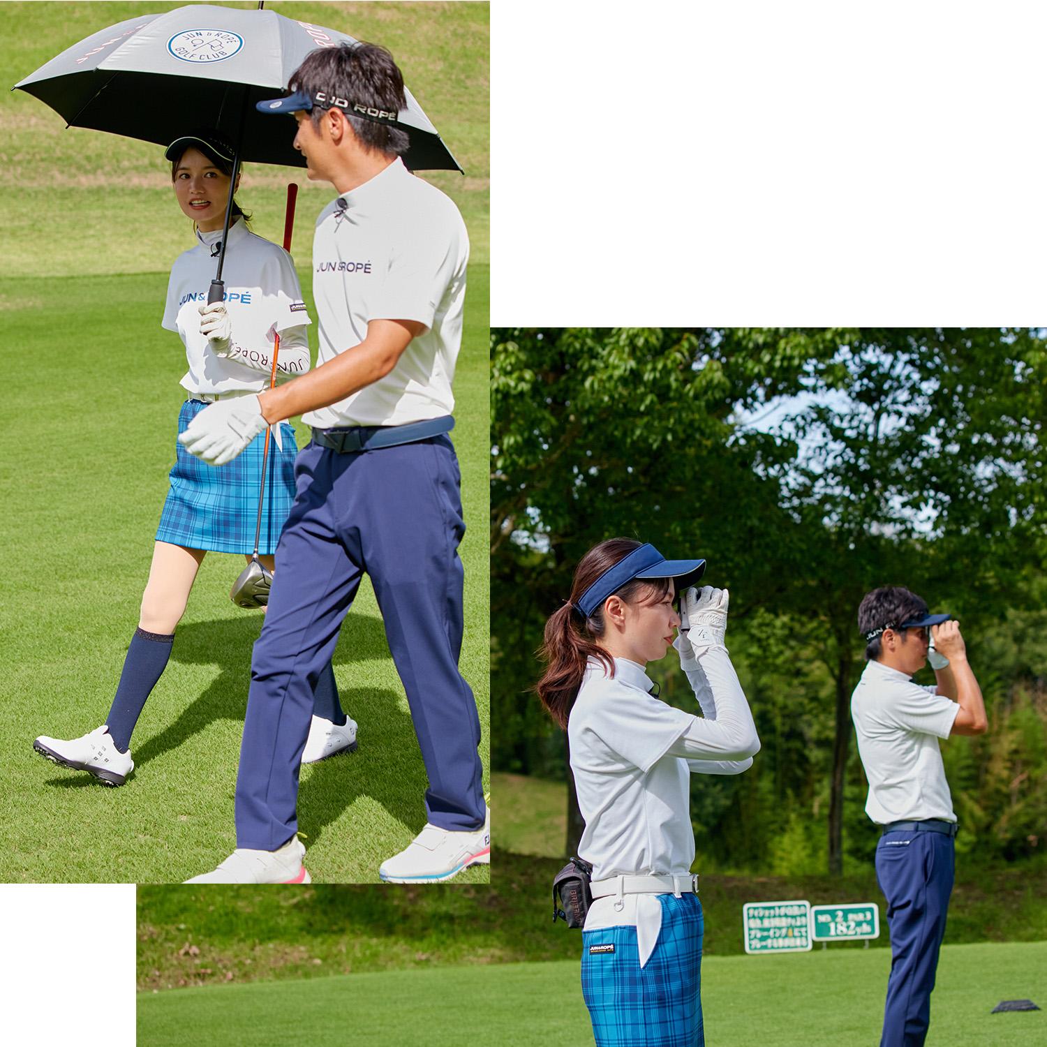 『JUN & ROPÉ』今季のテーマでもあるプレイド柄をモチーフにしたリンクコーデ。トップスのロゴにもさりげなくプレイド柄が使われているなど、ベタすぎないリンクぐあいがおしゃれです。UV対策もしっかりできて、試合はもちろん、練習時にも使いやすいシンプルなアイテムでスタイリングしています。モックタイプのトップスは、回収したペットボトルを使用したリサイクル繊維「ECO BLUE」を使用。さらさらとソフトで気持ちの良い着用感と、ストレッチ性に優れたスムーズに動ける素材です。