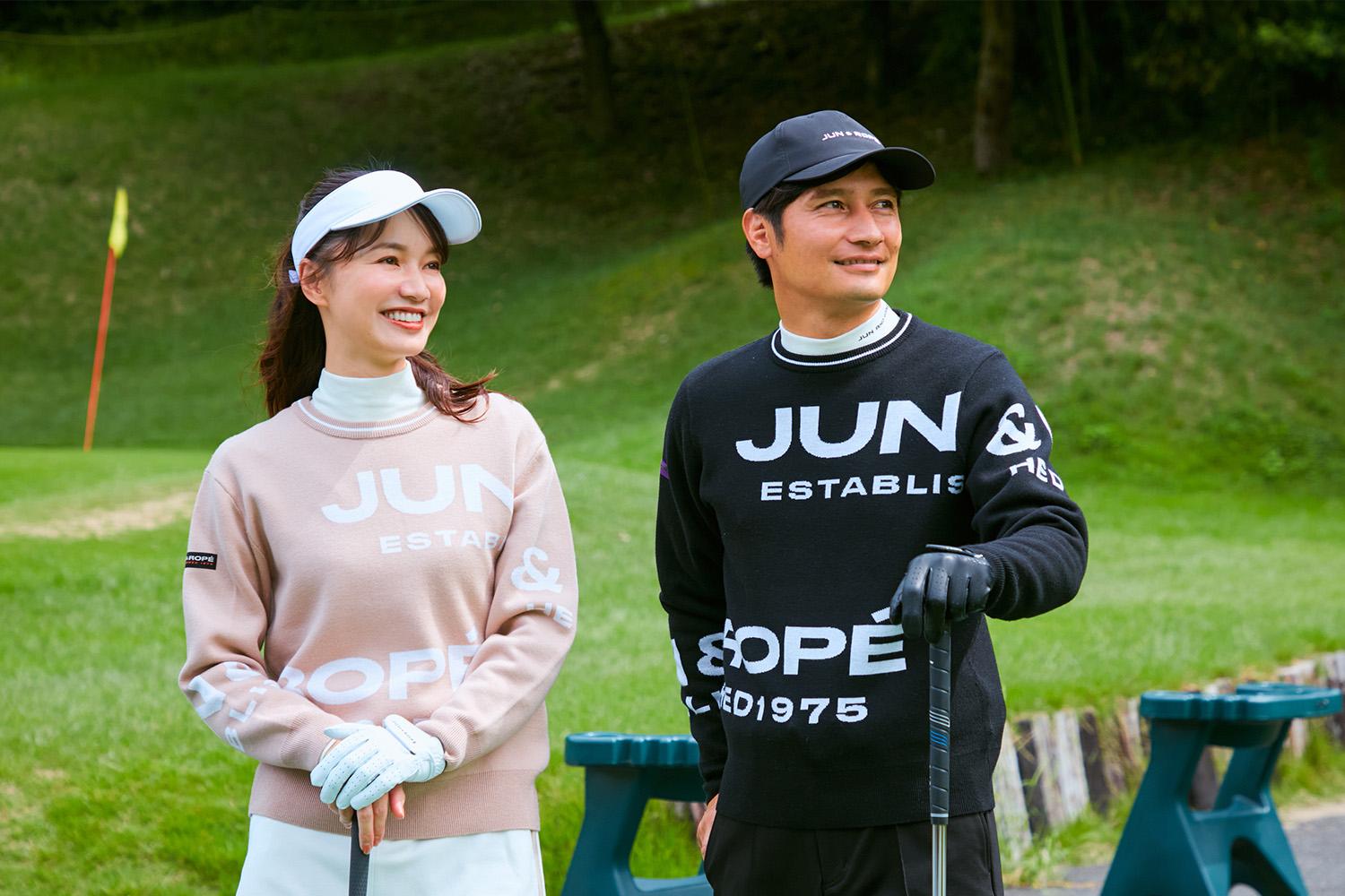 スタイリッシュでありながら、グリーン映えもばっちりなモノグラムニットを使ったリンクコーデ。クールな大人の雰囲気と、他にはないデザイン性の高さがあって、しっかりとペア感を出したい夫婦ダブルスの時などにもぴったりだと「パパ」もお気に入りのスタイリングです。ボトムは、メンズはストレッチ性の高いラインのキレイなパンツを、ウィメンズはサイドにラインの入った保温機能のあるAラインスカートを合わせて、競技ゴルフにも対応。