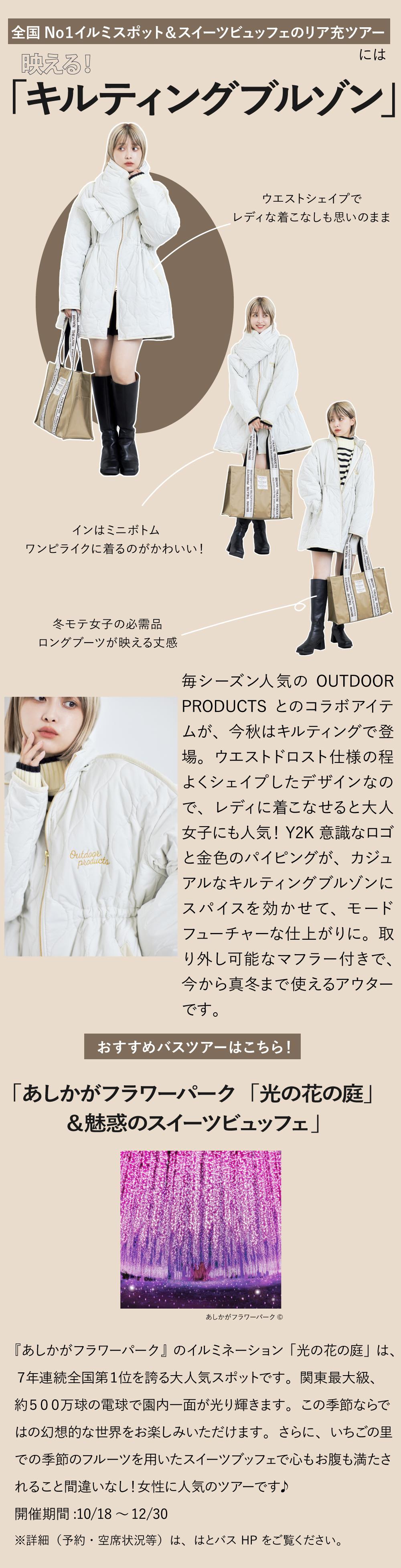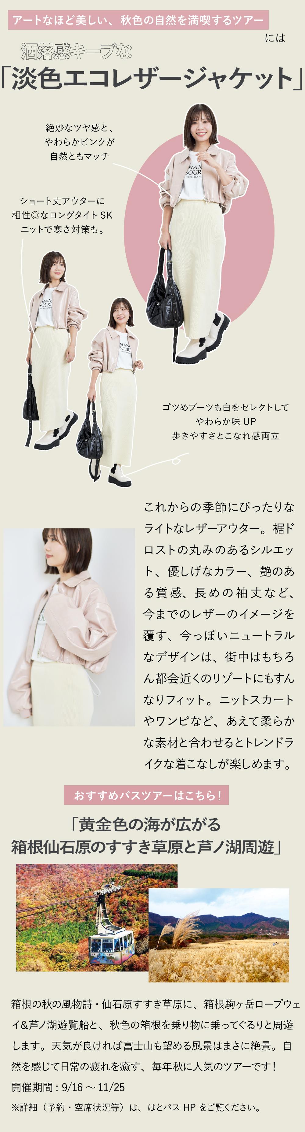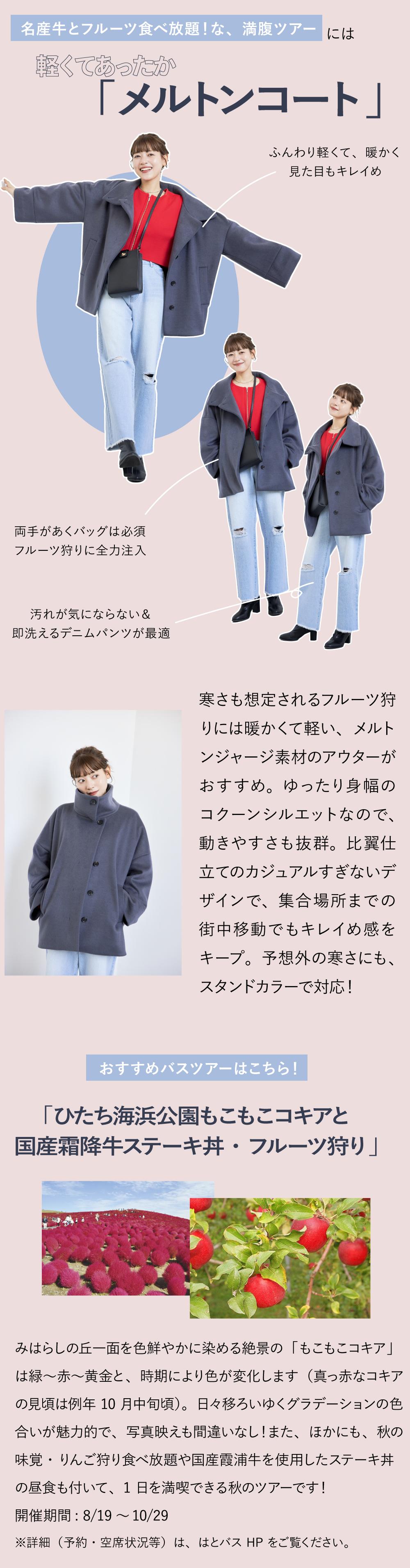 季節は秋!食・映え・景色、すべてがベストなこの時期に出かけないなんてもったいない!お手軽&便利なバスツアーなら、サクッとドライブ気分で楽しめます。さあ、お気に入りのアウターとともに“秋のご褒美”を見つけに出かけよう!