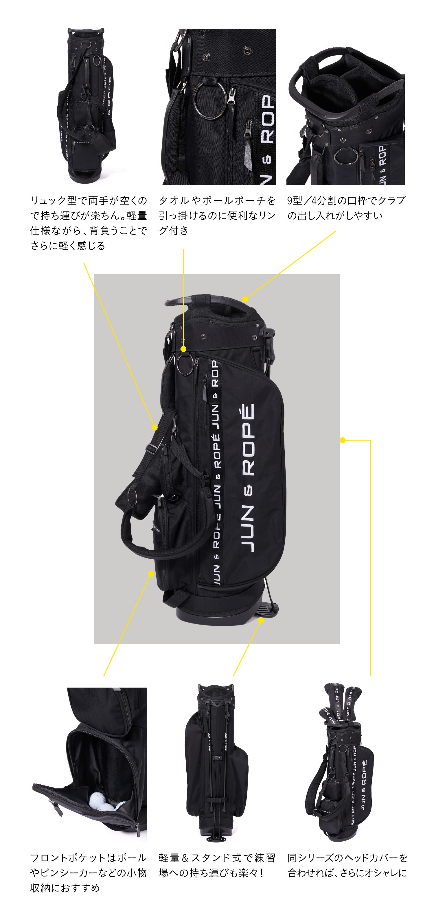 ロゴテープを使用し、シンプルでスタイリッシュなデザインのキャディバッグ。シンプルな仕切り状にする事で、クラブの出し入れもスムーズ!カートに乗せてもグローブや小物を取り出ししやすい豊富なポケット数が魅力的。ユニセックスでも使いやすいブラック・ホワイト・カーキの3色のカラー展開。