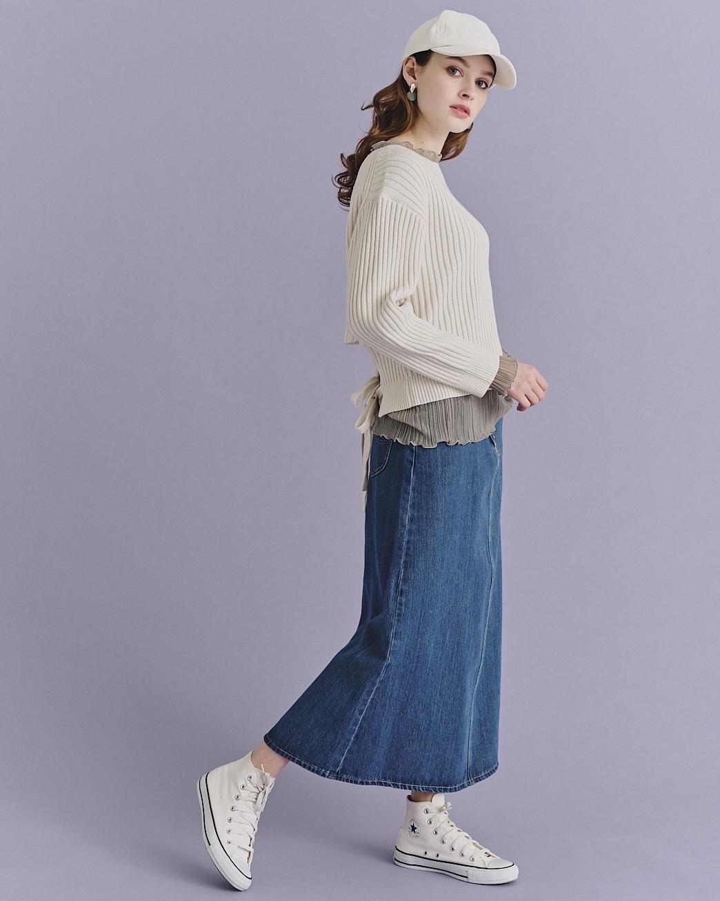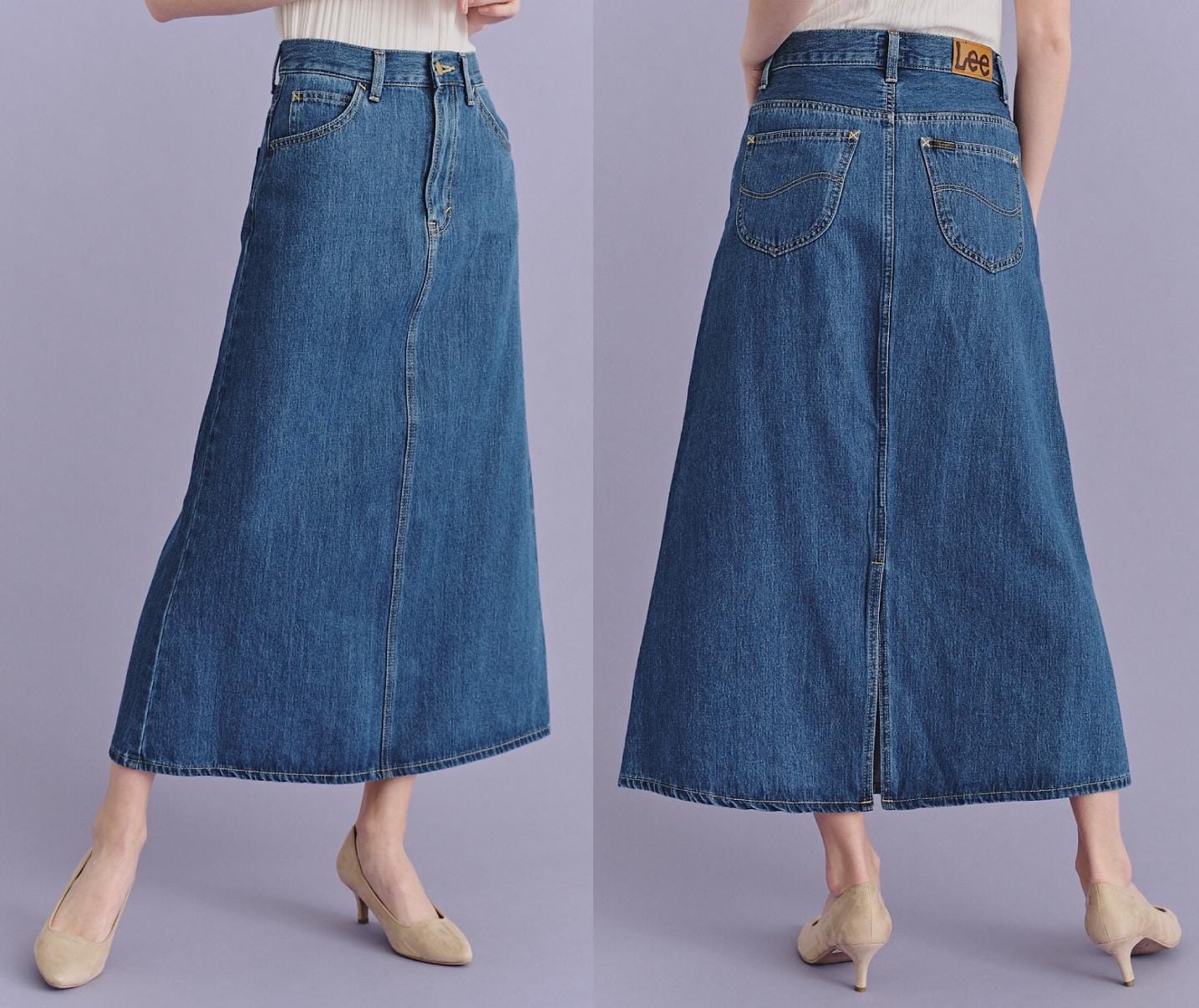 腰回りはすっきりさせつつ、裾にかけて広がるAラインシルエットがポイントのデニムロングスカート。 後ろ裾スリット入りで足さばきも◎