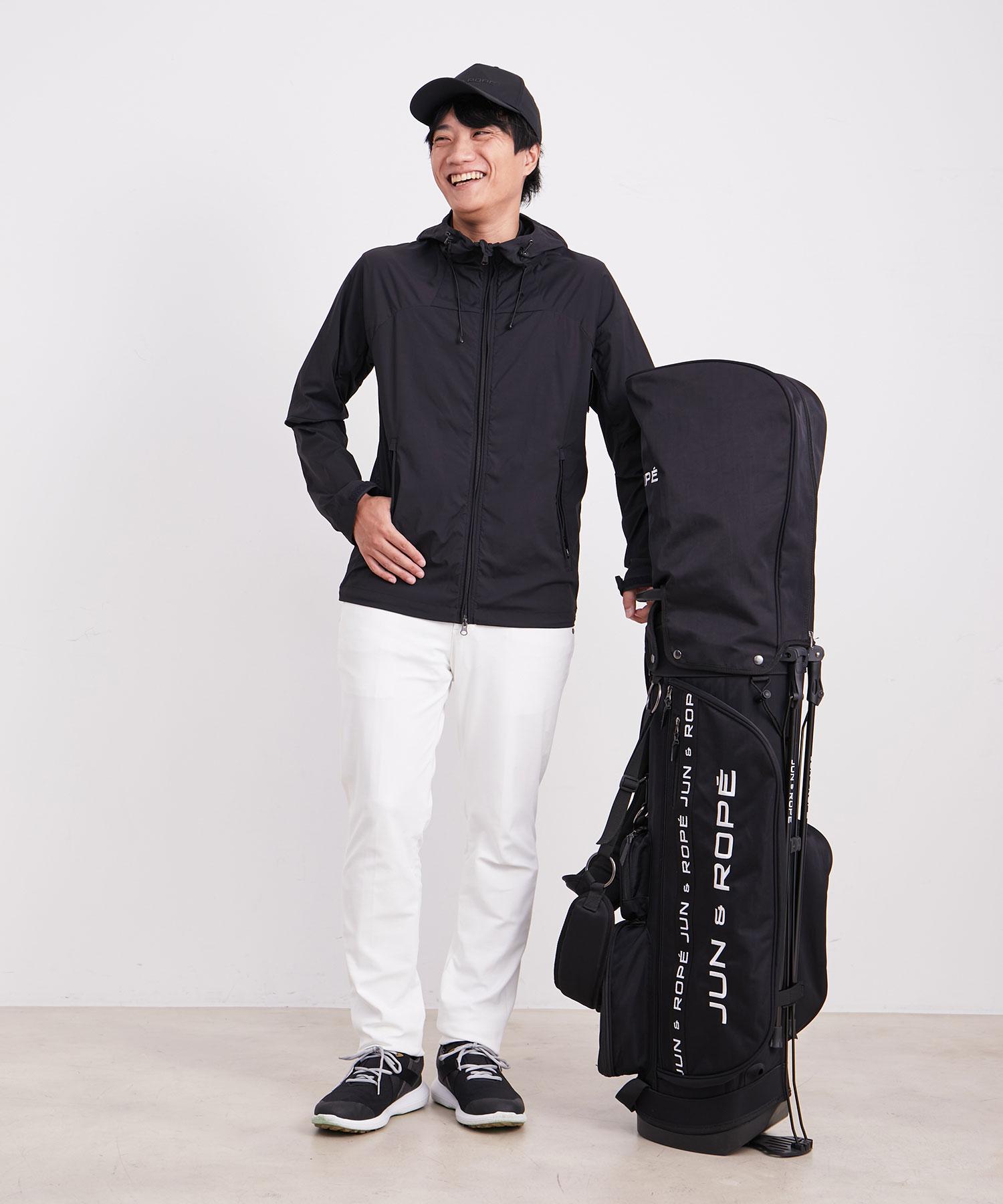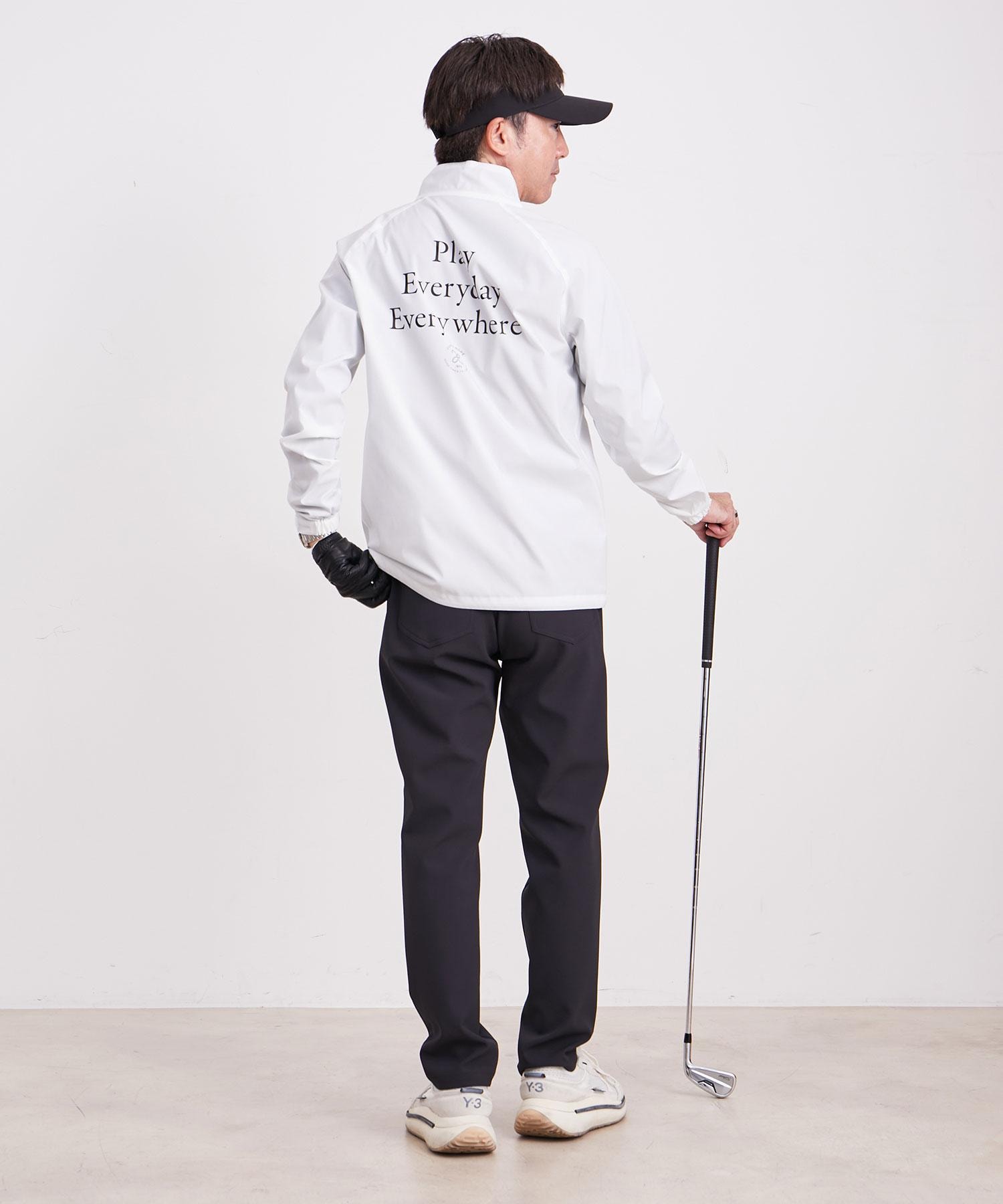 「秋口のゴルフは朝と日中の気温差が大きいので、さっと着られる羽織があると便利。このブルゾンは一見シンプルですがバッグのメッセージロゴがアクセントになってお気に入り。いつもは柄物などを選びますが最近はモノトーンコーデにはまっています。」
