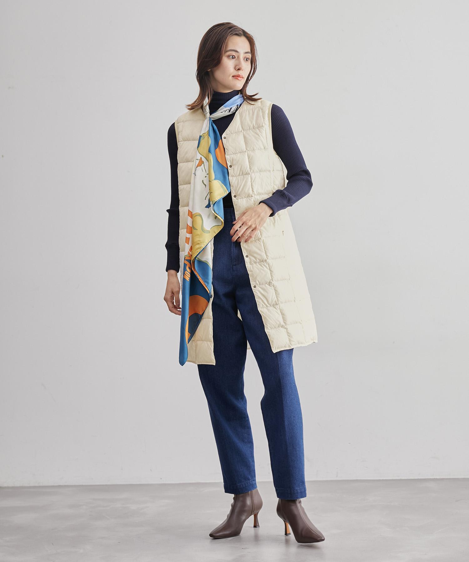 ダウンベストの魅力は、秋・冬・春の3シーズン着回せる汎用性の高さです。また、合わせるアイテム次第で幅広い着こなしを楽しめるのも特徴。白のダウンベストはエレガントな雰囲気に仕上がるので、スカーフとも相性◎。