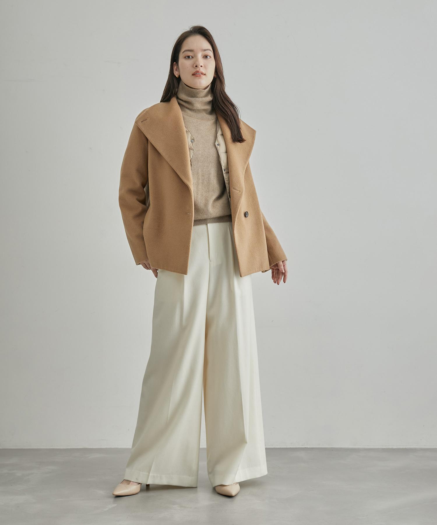 キャメルと白の大人配色を壊さないように、インナーダウンはキャメルと同系色のカーキをチョイス。お洒落見えに効果的なキャメル×白のスタイリングは、テクニックいらずで品よく垢抜けるコーデのお手本。