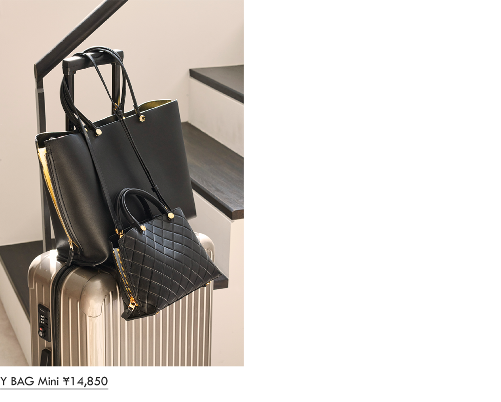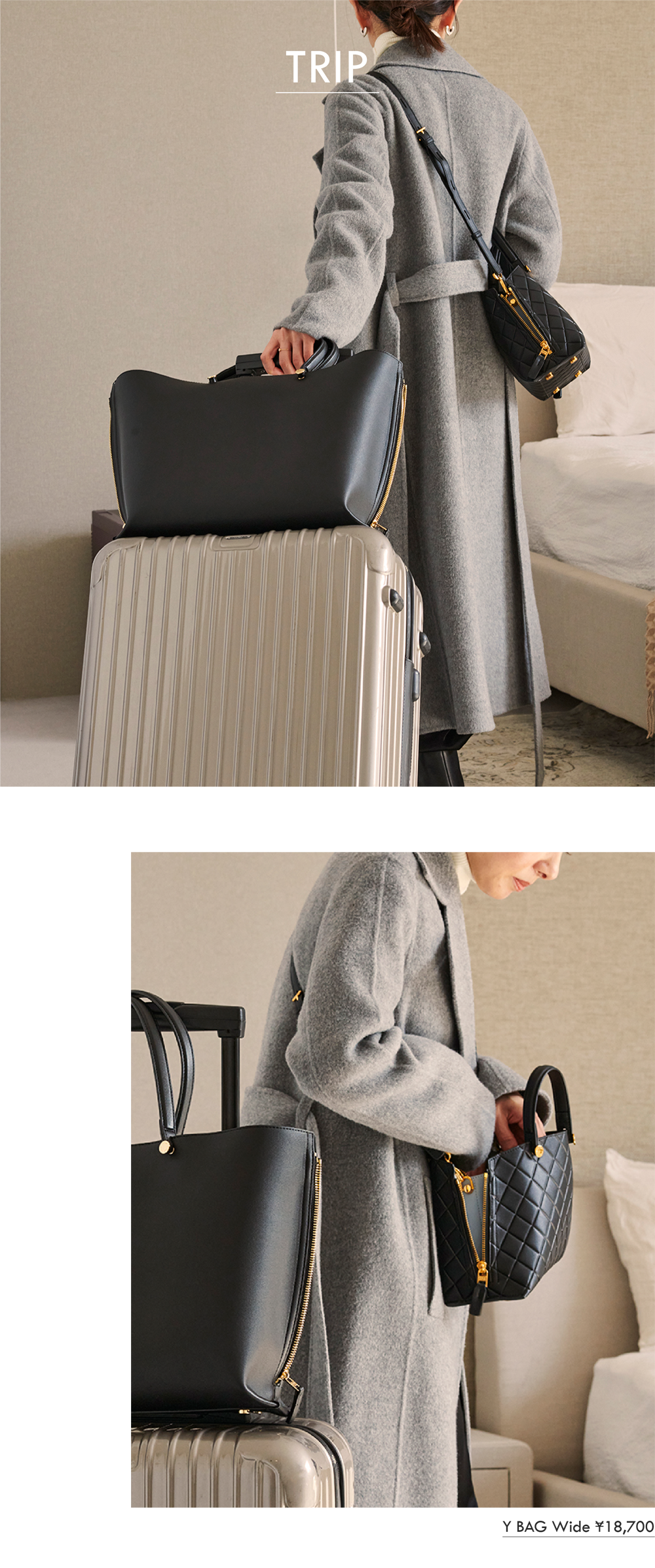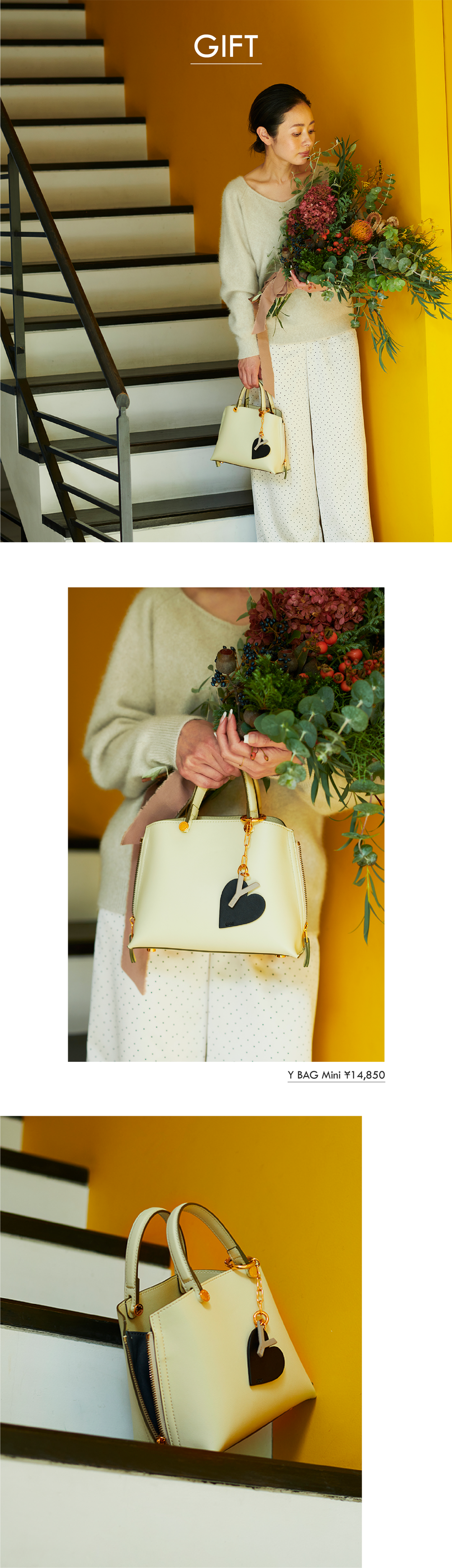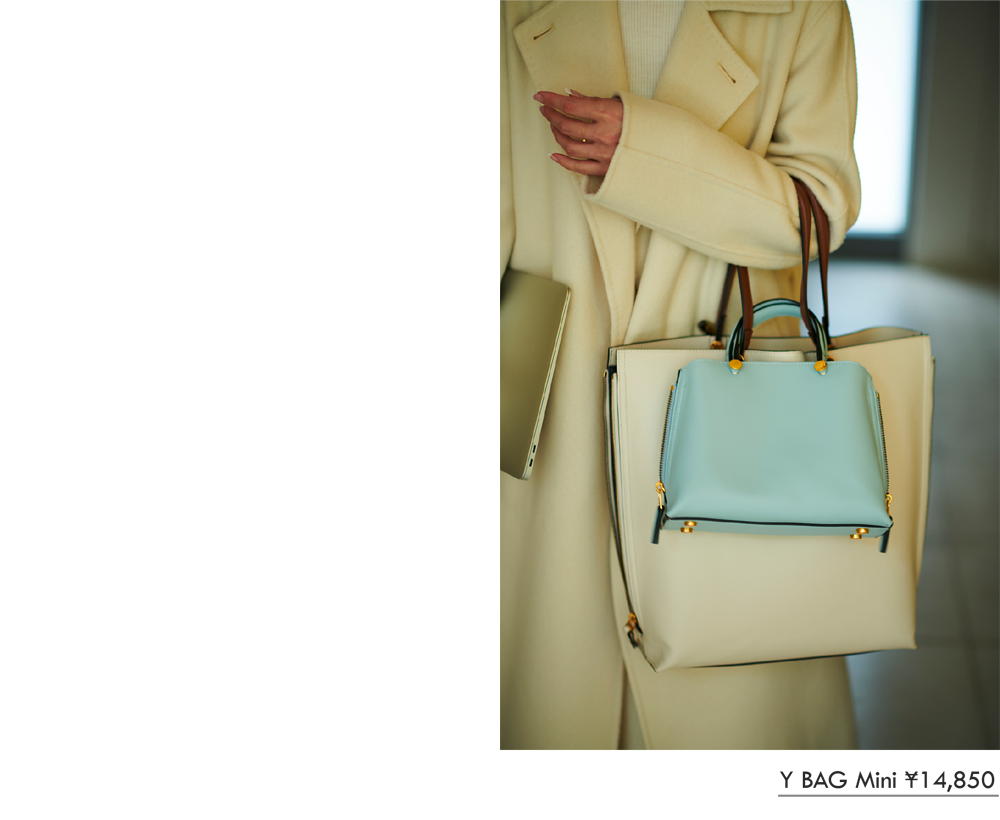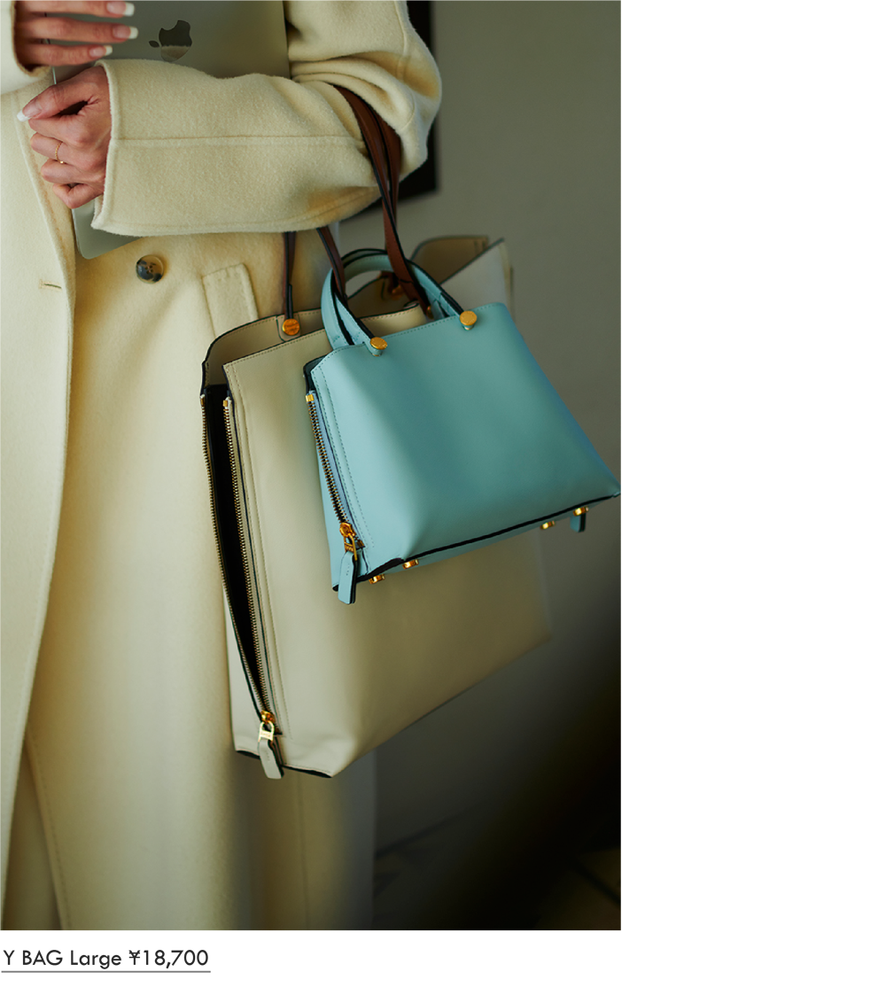 エレガントなビッグサイズの「Y BAG Wide」と、アクセサリー感覚でアクセントにもなる「Y BAG Mini」の2個持ちスタイル。
