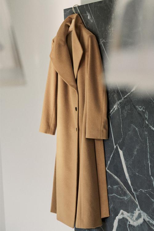 襟が大きく小顔効果も。釦を全て止めればスタンドコートとしても。