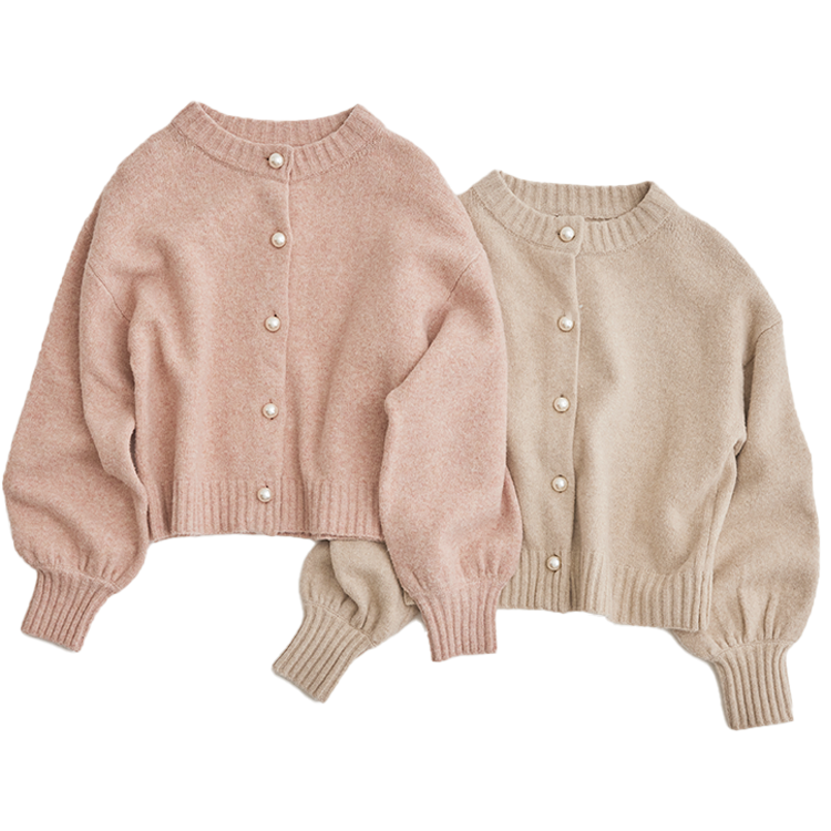 大きめサイズのパール釦が付いた女性らしいニットカーディガン。