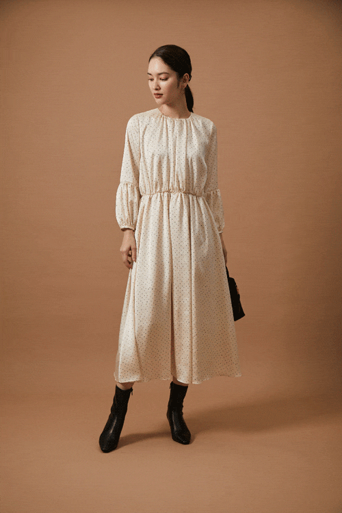 ウエストゴムギャザーでリラックス感のある着心地ながら、ウエストマークされることできちんと感をプラスしています。