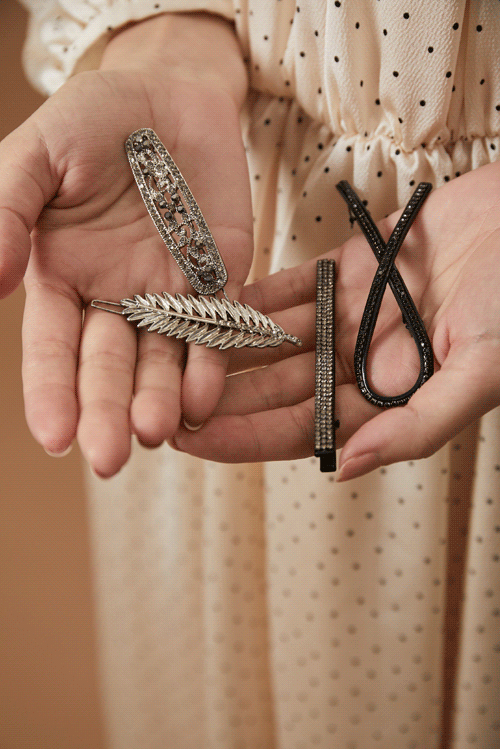 フェザーモチーフやフラワーモチーフのローマピンタイプとミニマルなラインストーンのデザインの2種。