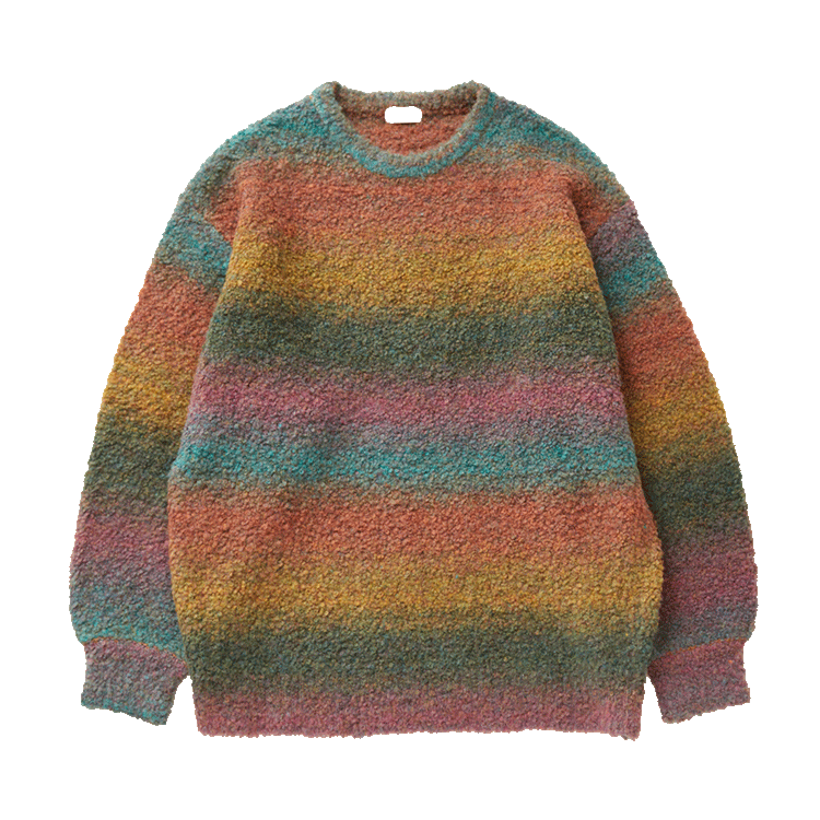 映えるグラデーションカラーと独自の凹凸感のふっくらとしたボリュームで非常に暖かみのある素材です。肌あたりも良くチクチクとした感じもなく男女問わず快適に着用できます。