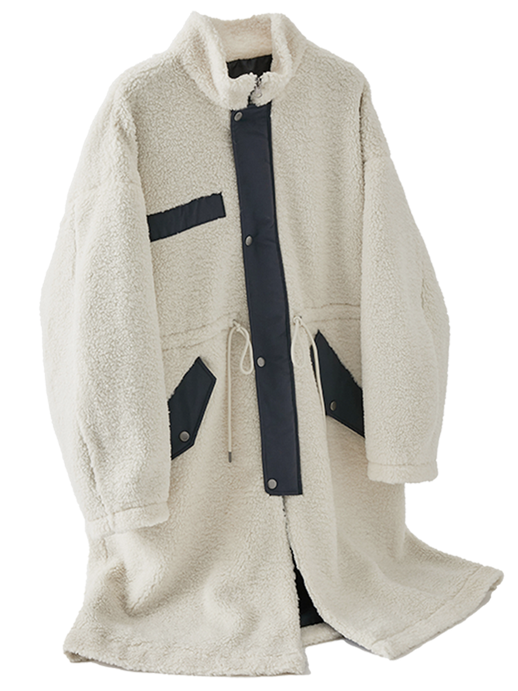 毛足が長くプードルのようなボリューム感と少しフェミニンで柔らかい印象です。手触りも非常によくソフトな風合いと確かな保温力があるので真冬でも問題なく着用いただけます。