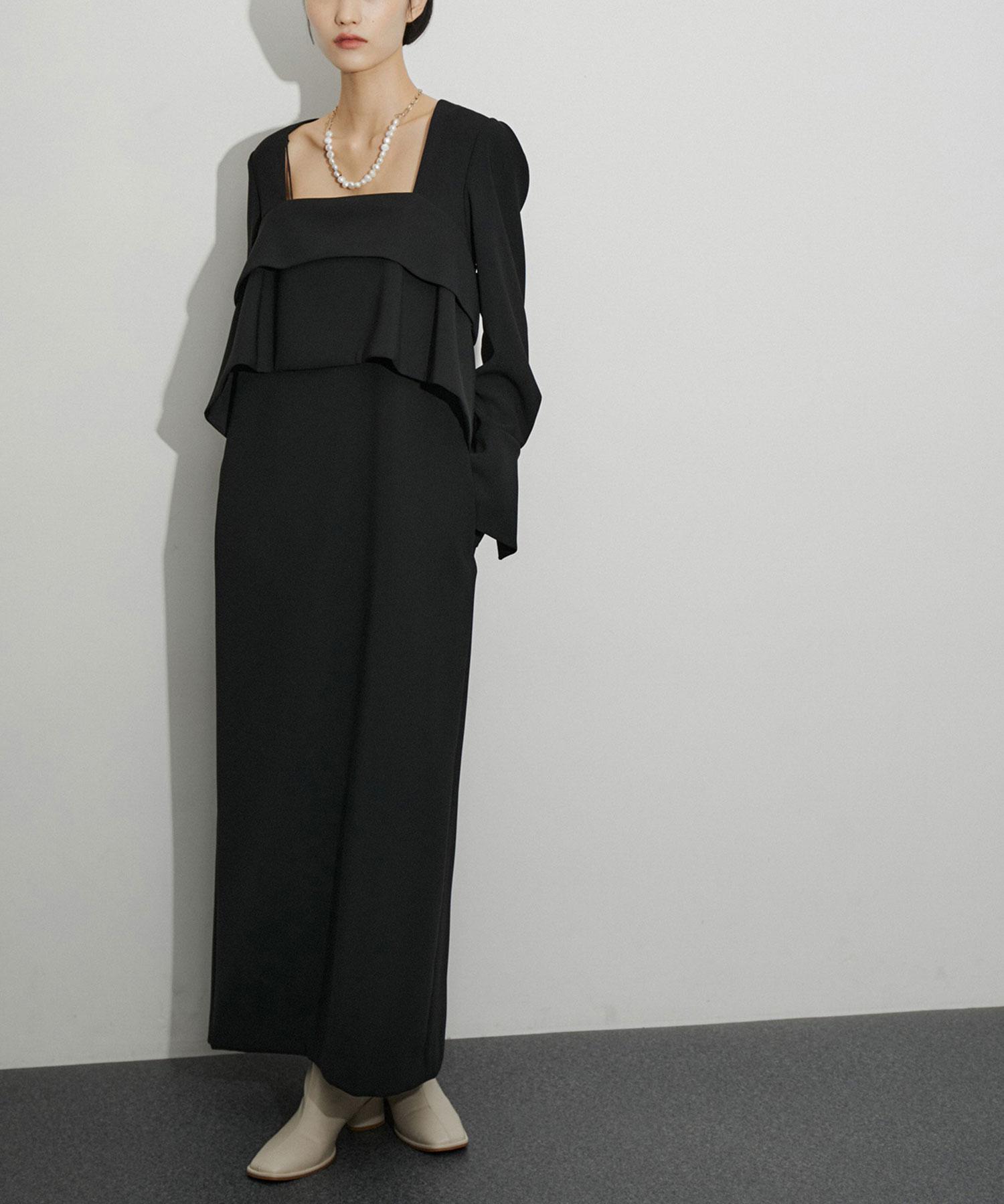 ペプラムブラウスとリーンスカートをスタイリングしているかのような一体型ワンピース。控えめなショルダータックから細めな袖やデコルテ見えの衿元、潔いリーンシルエットスカートなど、モードな雰囲気にこだわった一着。
