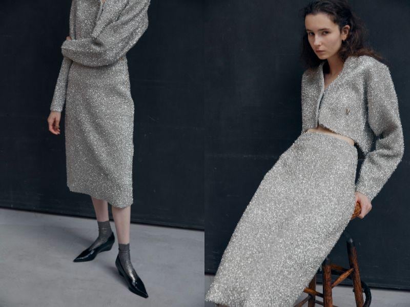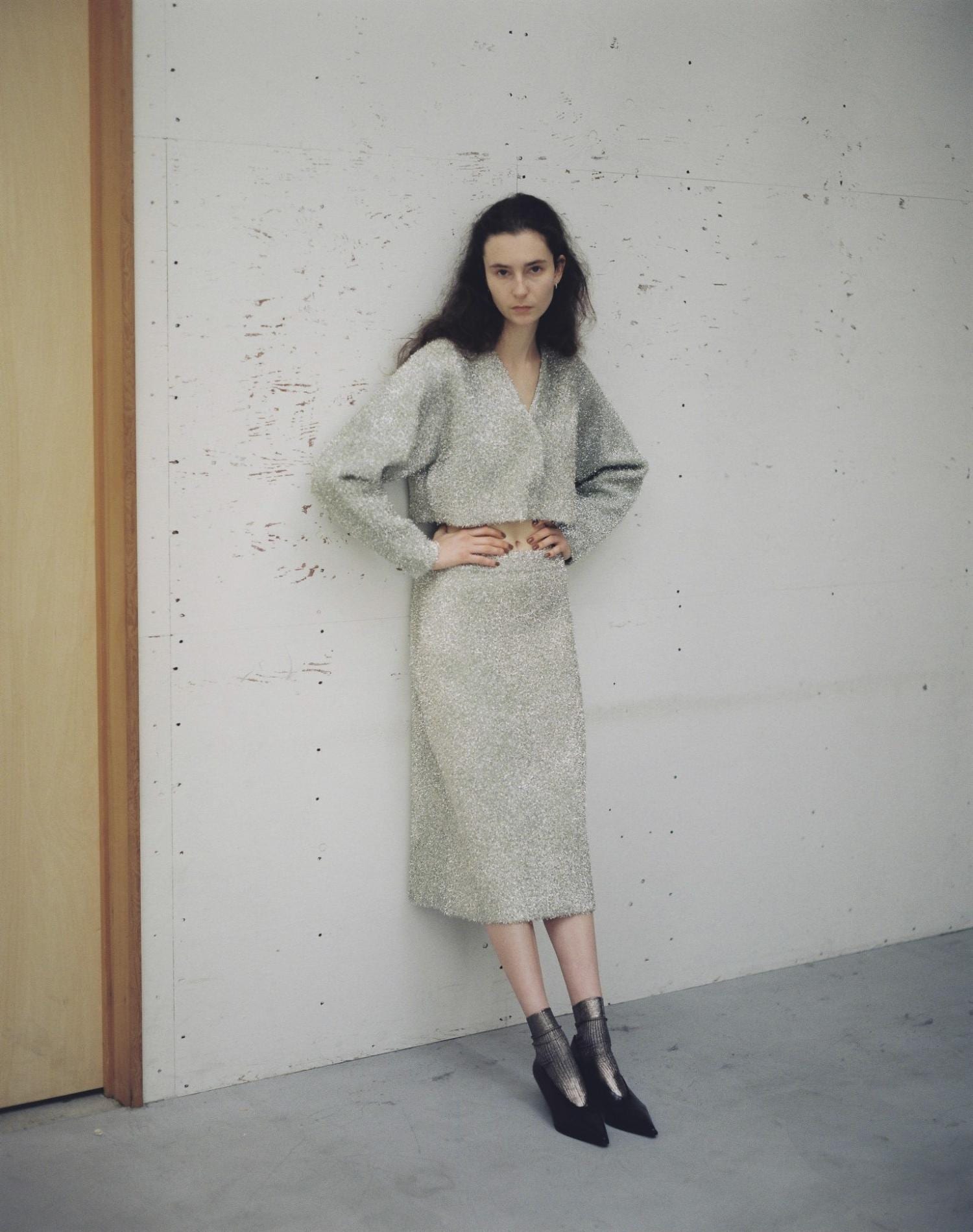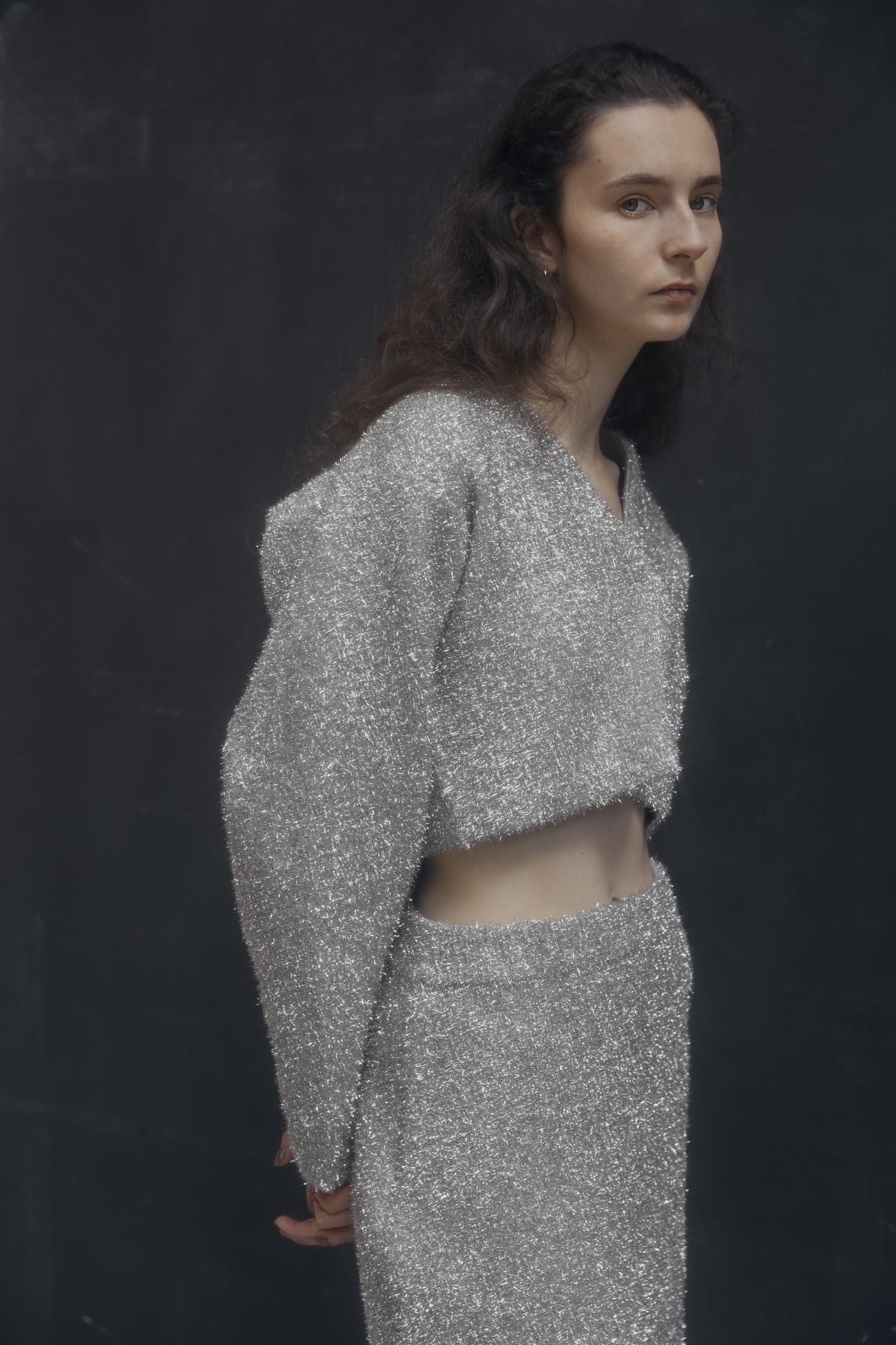 ホリデーシーズンにぴったりのきらびやかなメタリックシャギーを使用したカーディガンとスカートの2型制作。