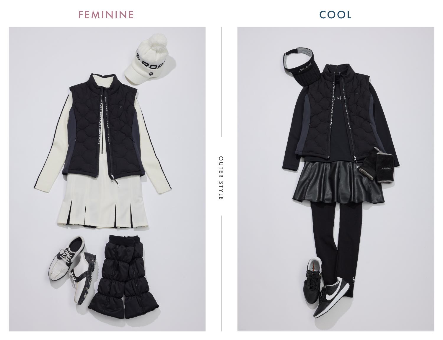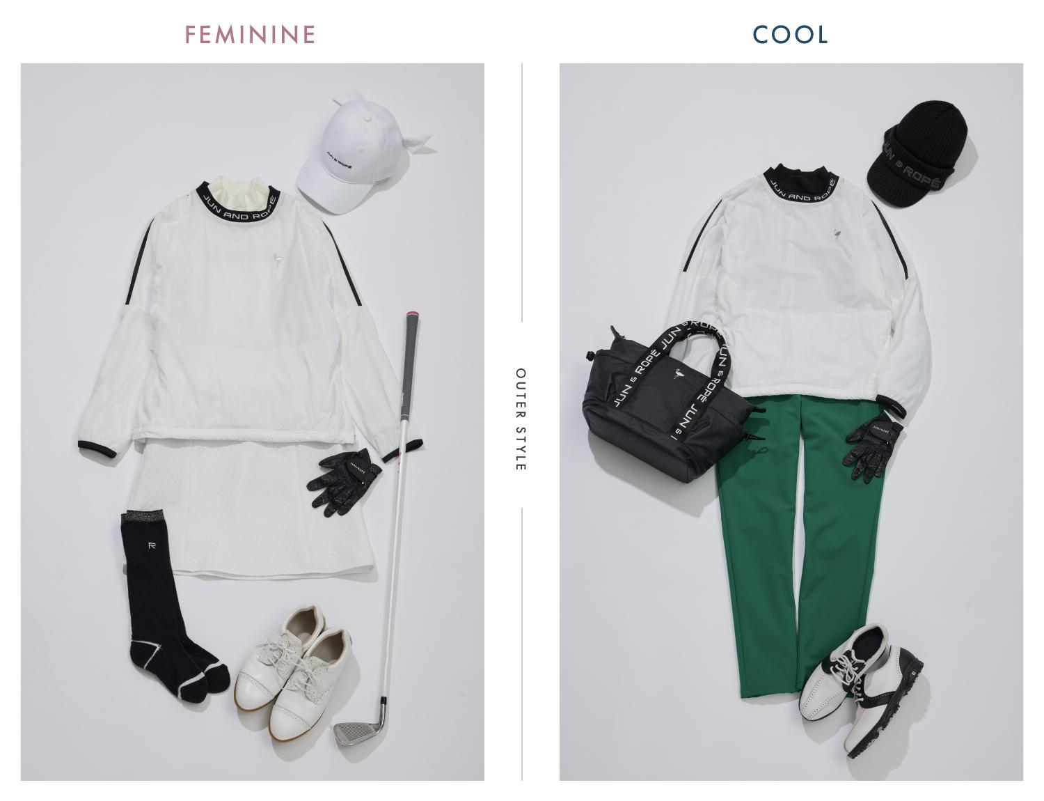 保温・吸汗速乾・遮熱を兼ね揃えた高機能保温裏地付きのプルオーバータイプ軽アウター。フェミニン派はキルティング調のフレアスカートを合わせ、可愛らしさをプラス。ホワイトコーデが冬のゴルフ場で映えること間違いなし!クール派はグリーンのテーパードパンツを合わせてスポーティーな印象に。ブラックの小物を効かせることで、ゴルフ上級者のようなこなれたスタイリングが完成します。