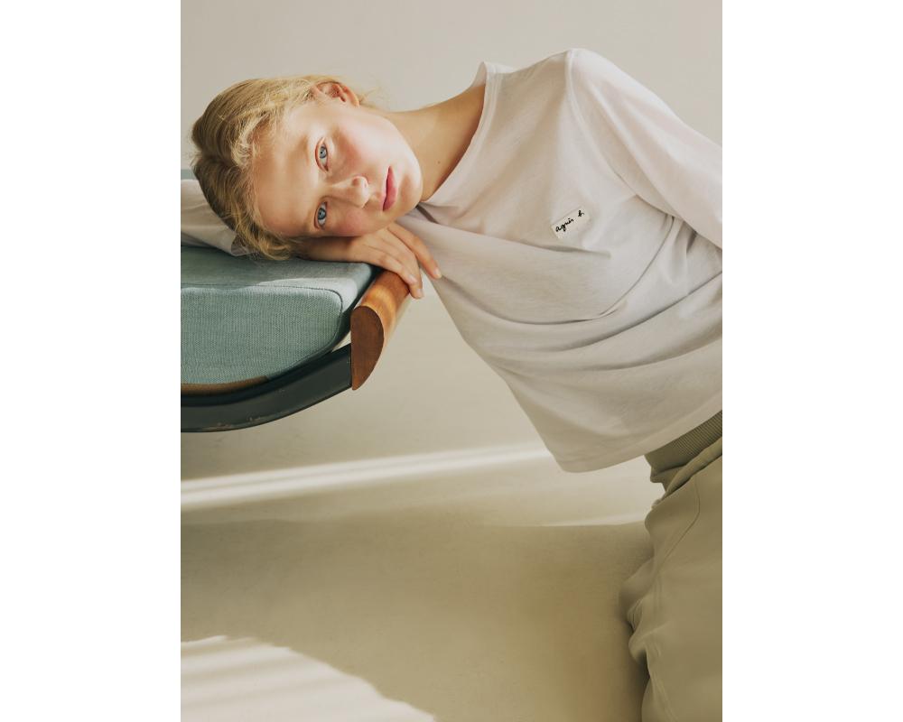 左胸にはagnès b.のロゴが刺繍されたワッペン付きで、今回定番カラーのグレーと春らしいピンクベージュの2色をご用意いたしました。