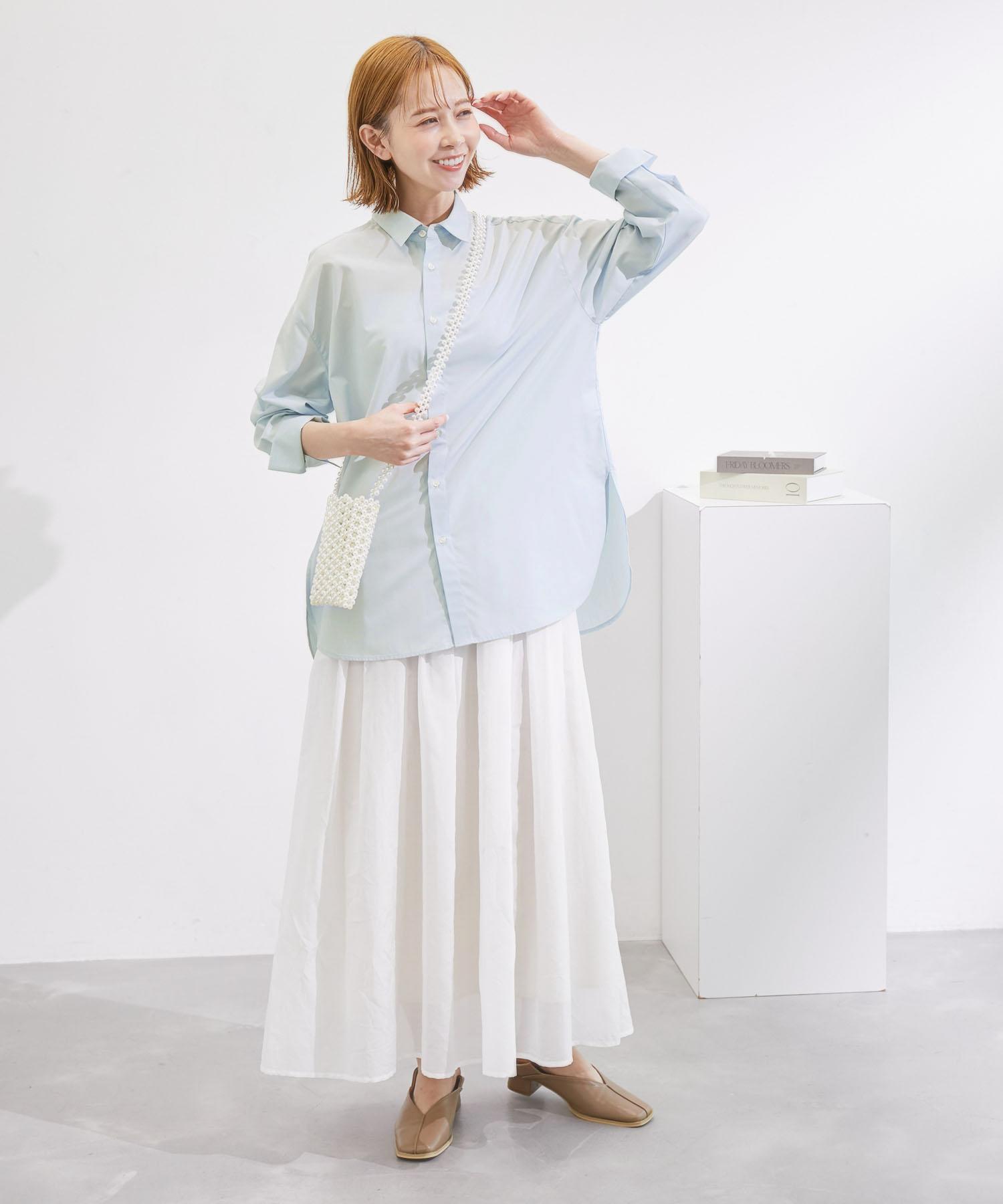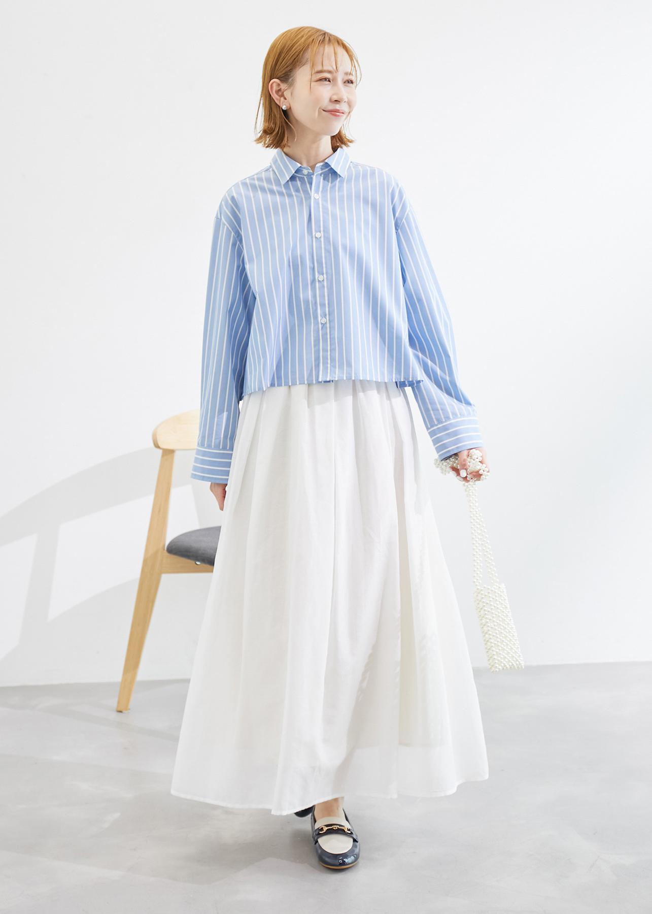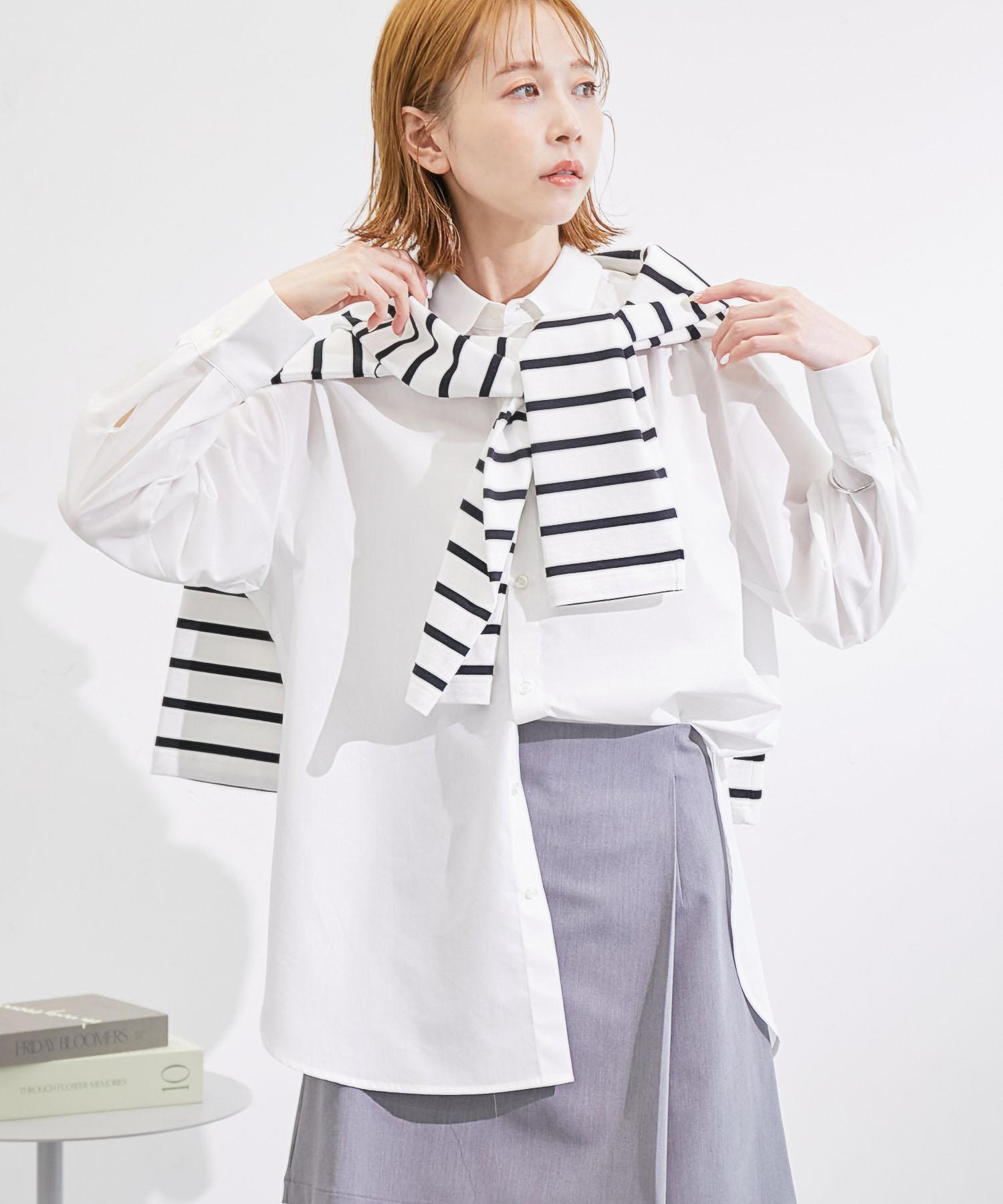 シンプルな無地とストライプシャツはインナーや羽織としても、