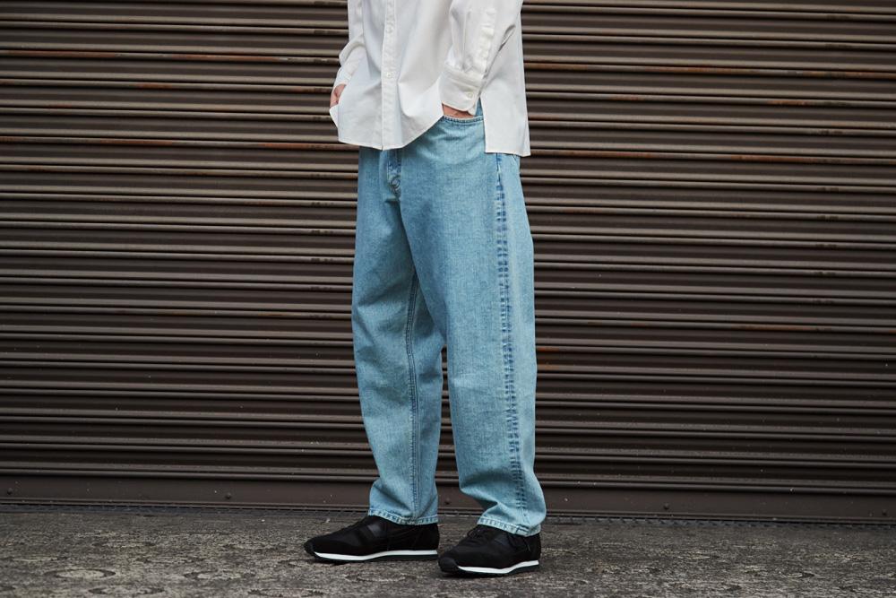 USED加工の12.5オンスのデニムは、ヴィンテージ感をたっぷりと楽しめる表情豊かな素材感。70年代に使われていたものと同様の『LEE』タグを使用したり革パッチを採用するなど、往時のディテールを再現。デザインは腰回りをゆったりさせ、裾にかけてゆるやかにテーパード。今っぽく穿きやすいシルエットにアップデートされている。