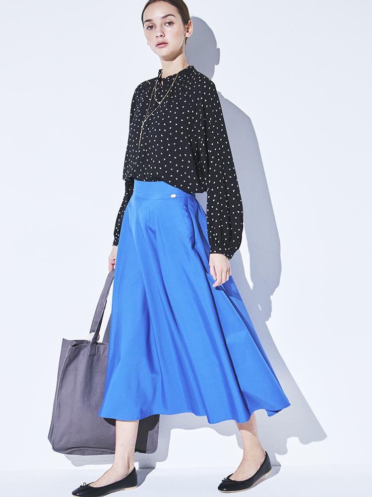 きちんと感を備えたスタンドフリルブラウス。女性らしいボリューム袖と同色染めの貝ボタンがポイント。