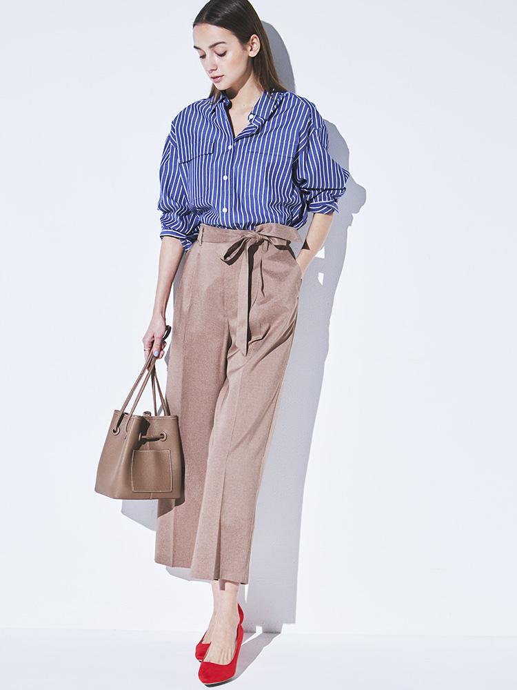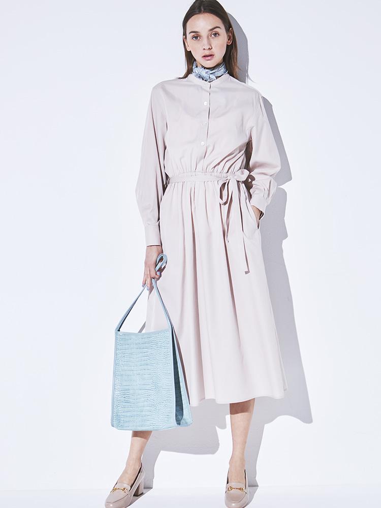 シンプルなスタンドカラーが上品な大人の着こなしを演出。ウエストギャザーで女性らしさも備えています。